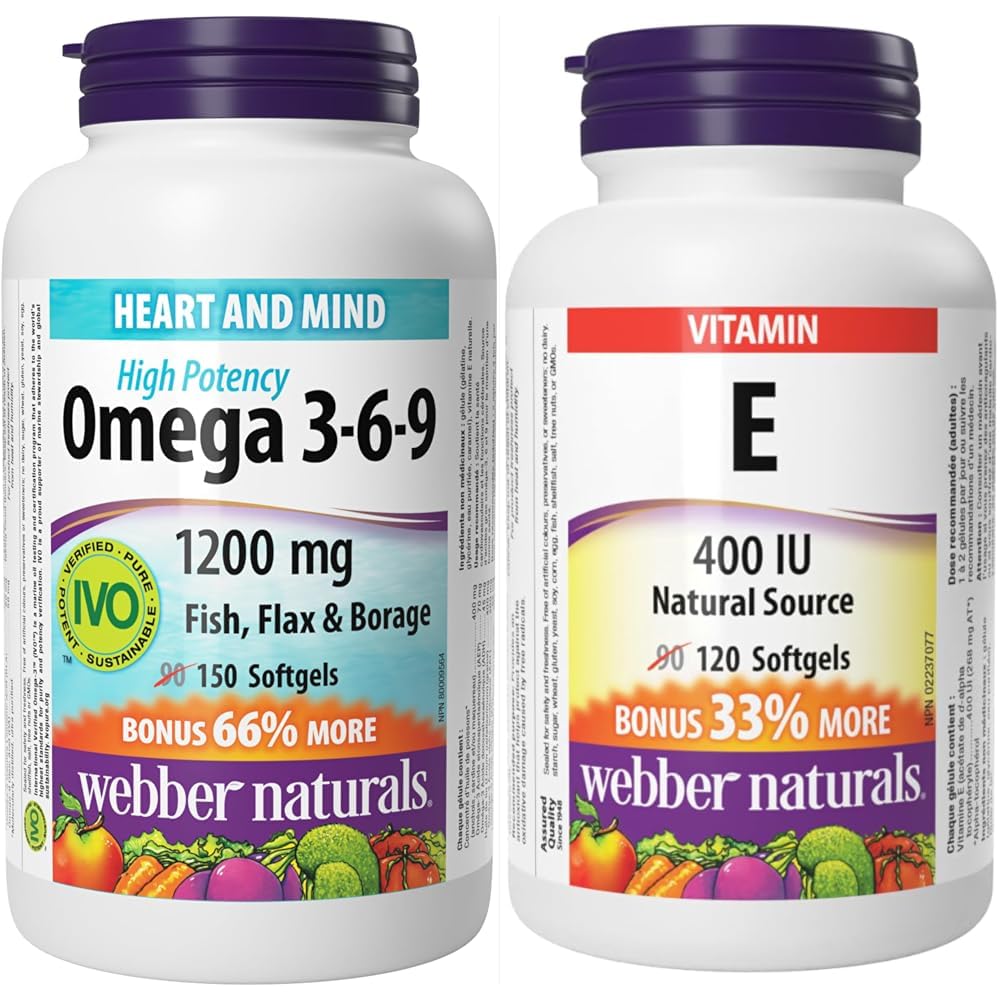 Webber Naturals Omega 3-6-9 1,200 mg Fish Oil, 150 Softgels, Supports Cardiovascular Health and Brain Function Omega-3 and omega-6 are essential fatty acids, EFAs. Omega-9 fatty acids can be formed in the body. They are not, technically, “essential”, but work in balance with omega-3 and -6 for the maintenance of good health. All three are important and healthy dietary fats. Ensure optimum balance with Omega-3-6-9 from Webber Naturals. Webber Naturals Vitamin E 400 IU, 120 Softgels, Natural Source of Vitamin E, Antioxidant Support Webber Naturals Vitamin E 400 IU provides the cold-pressed, highly bioavailable form of vitamin E (d-alpha tocopheryl acetate). This non-GMO formula is free of artificial colours, preservatives, and sweeteners, and offers antioxidant support against oxidative stress for the maintenance of good health. Each easy-to-take softgel contains 400 IU of vitamin E in a base of flaxseed oil for enhanced absorption.Product 2: Natural source of vitamin E (d-alpha tocopheryl acetate), twice as bioavailable as synthetic vitamin E. Product 2: No chemical solvents are used. Product 2: Extracted by cold-pressing methods that do not damage the tocopherols. Product 2: Provides antioxidant support. Product 1: Free of: Artificial colours, preservatives or sweeteners; no dairy, sugar, wheat, gluten, yeast, soy, egg, shellfish, salt, tree nuts or GMOs. Product 1: Sourced from a Sustainable Environment: Fish Oil from Webber Naturals is concentrated for potency, purified for safety, and naturally sourced from a sustainable environment. The IVO (International Verified Omega-3) seal on this product indicates that its fish oil components are certified to have met the world’s highest standards for purity, potency, and sustainability. Product 1: Each Easy-to-Swallow Softgel Contains: 400 mg each of certified organic high lignin flaxseed oil, borage oil, and wild fish oil. Product 1: Supports Cardiovascular Health and Brain Function: Omega 3-6-9 provides a full spectrum of essential fatty acids (EFAs) that play important roles in the development and functioning of the nervous system as well as cognitive, cardiovascular and skin health.