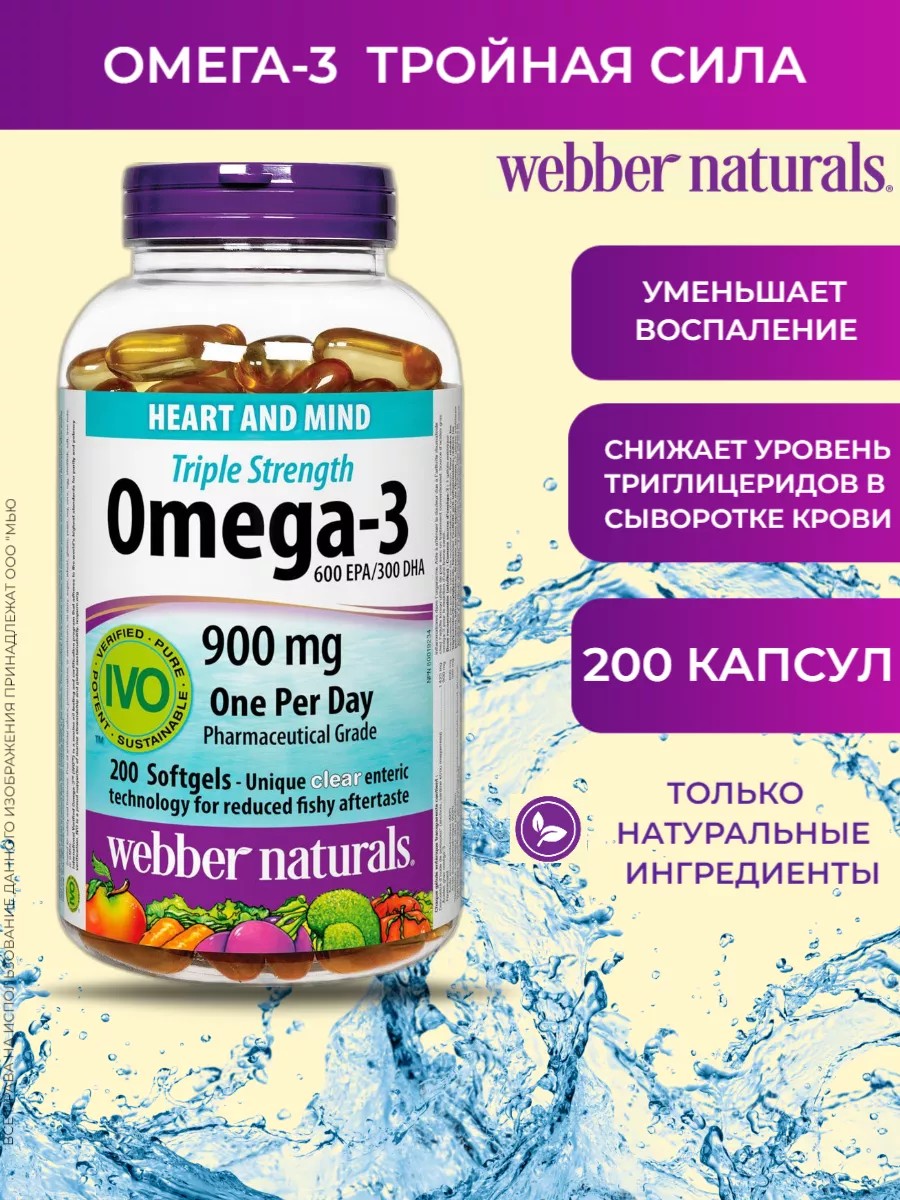 Омега-3 тройного действия укрепляет здоровье сердечно-сосудистой системы и мозга, снижает уровень триглицеридов в сыворотке крови и уменьшает воспаление, а также улучшает настроение. Омега-3 от Webber Naturals производится из жира дикой рыбы.