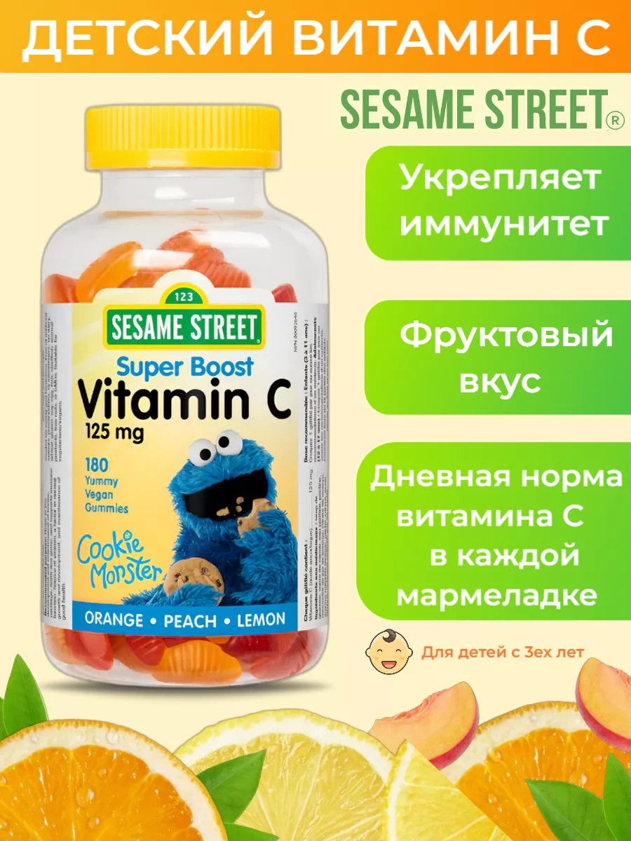 Мармеладки с витамином С "Улица Сезам" – это часть новой линейки пищевых добавок, разработанных специально для детей в возрасте от 3 лет и старше, чтобы привить им здоровые привычки. Каждая вкусная мармеладка без желатина с фруктовым вкусом содержит 125 мг витамина С, который способствует развитию костей, хрящей, зубов и десен, а также поддерживает иммунную систему.