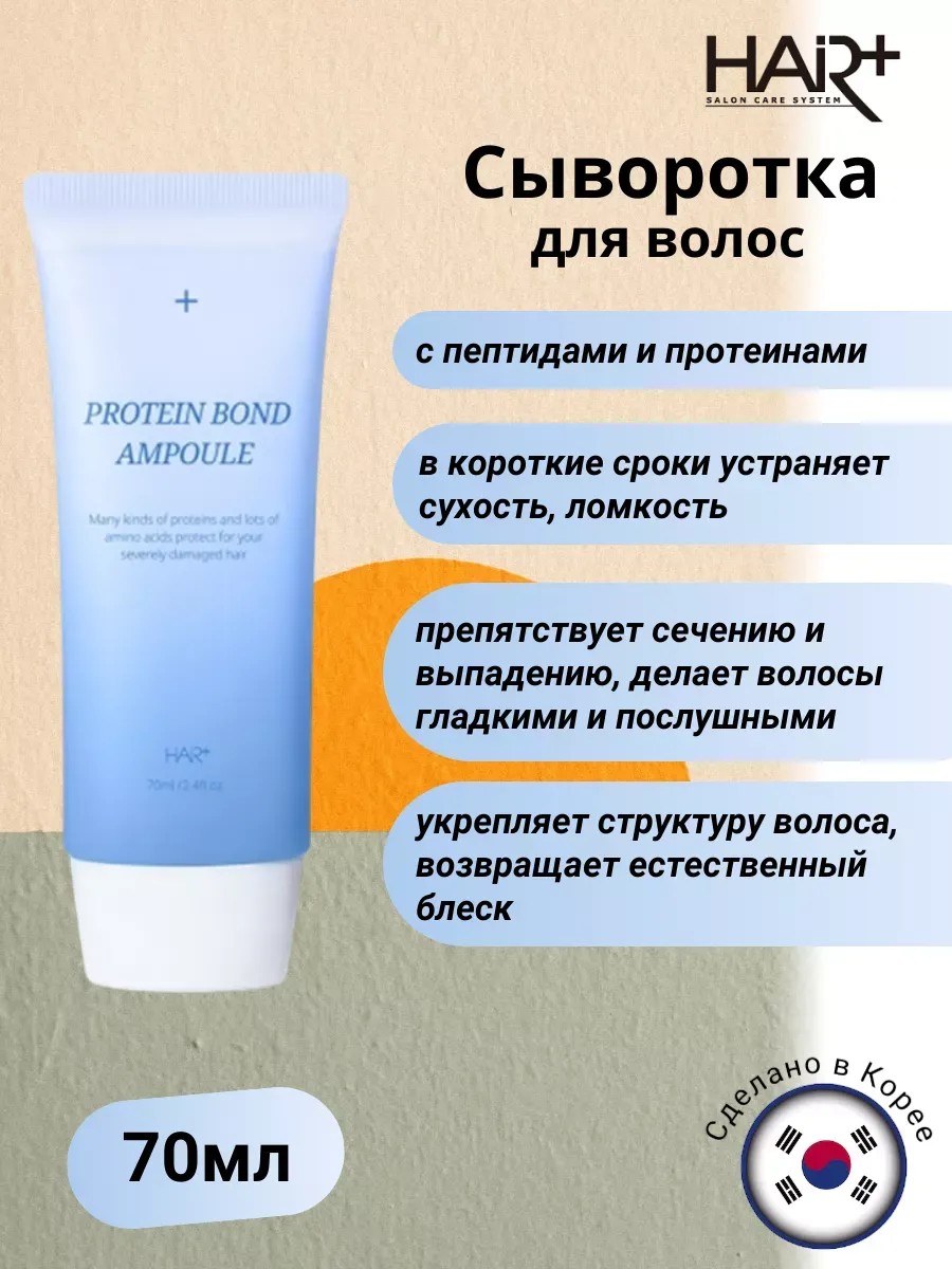 Hair Plus Protein Bond Ampoule, a serum for damaged hair, envelops each strand: it eliminates breakage, increasing density, restores hair structure by filling damaged areas, smoothes keratin scales, seals split ends, and adds softness and shine. This restorative hair serum with peptides and proteins, Hair Plus Protein Bond Ampoule, intensively revitalizes hair, quickly eliminating dryness and breakage, preventing split ends and hair loss, and leaving hair smooth and manageable. It strengthens the hair structure and restores natural shine. The serum gently cares for weakened hair, restoring dry and damaged locks. It forms an invisible protective shell that protects against hot air, temperature fluctuations, and other external factors, making styling, curling, and straightening safer. Deeply moisturizes and nourishes, smoothes keratin scales, and fills damaged areas. This creamy texture spreads easily over the entire length of the hair without weighing it down or creating a greasy shine. Key active ingredients: A complex of 7 peptides improves hair elasticity. They integrate into the hair structure, making it denser and stronger, and supporting its protective functions. A complex of 20 amino acids deeply restores the hair structure, integrates into damaged areas, strengthening and maintaining the protective layer. They make hair more resistant to external irritants, adding smoothness and strength. Hydrolyzed collagen and elastin, hydrolyzed keratin, and lactic acid. Suitable for damaged hair. Directions for use: Apply a small amount of serum to pre-cleansed, damp hair, concentrating on damaged areas and ends. Do not rinse.