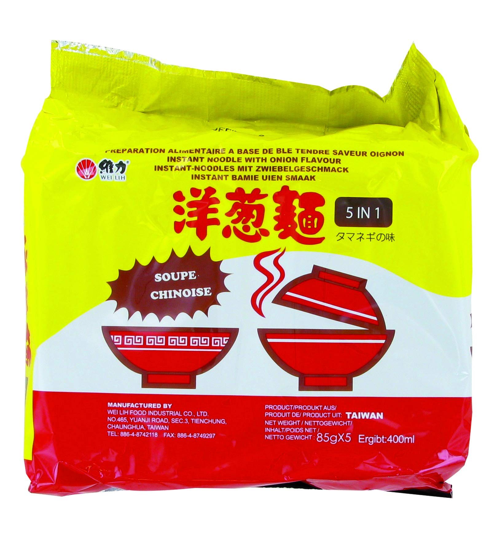 Traditional Taiwanese instant noodle soup with onion flavor - Wei Lih brand - Ready in 3 minutes. Sold in packs of 5 sachets. INSTRUCTIONS FOR USE Pour 350ml of boiling water into a bowl with the noodles, then cover and let stand for 3 minutes before serving.