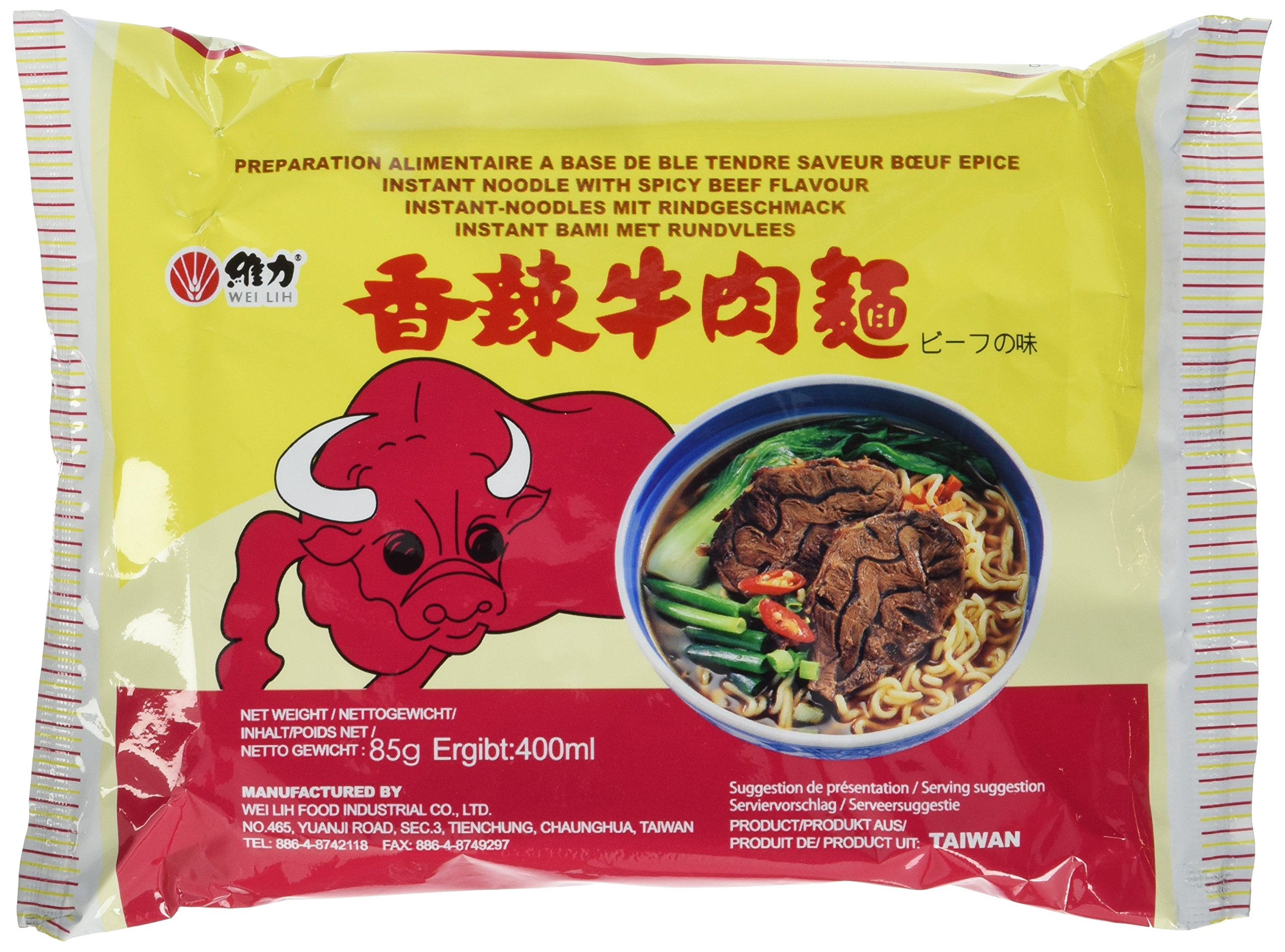 WEI LIH Beef Flavor Instant Noodles. Firm noodles and flavorful soup, taste the difference of noodles from the world-renowned WEI LIH brand. INGREDIENTS Noodles (78.2 66.5g): Soft wheat flour (73 ), refined palm oil, tapioca starch, salt, soy sauce (water, soybeans, wheat, salt), thickeners: E466, E412, humectants: E452, E451, E339, E450, sesame oil, acidity regulator: E501, antioxidant: E306. Seasoning paste (16.7 14.2g): Refined palm oil, chili paste (chili, salt), SOY sauce (water, SOYBEANS, WHEAT, salt), salt, sugar, spices, ginger, flavouring, antioxidant: E306. Seasoning powder (5.1 4.3g): Salt, flavour enhancers E621, E640, E631 E627, dehydrated bok choy, color: E150a, maltodextrin, acidity regulator: E331, yeast powder, seasoning powder (hydrolyzed SOY protein, flavor enhancer (E621), salt, glucose, yeast extract, xylose, anti-caking agent (E551), palm oil), seasoning powder (SOY sauce powder, salt, yeast extract powder, dextrin, onion powder, palm oil, flavor enhancers (E621, E627), color (E150a)), yeast extract, flavoring. SAFETY WARNING Do not expose to sunlight See moreWei Lih Nouilles Instantanées Saveur Bœuf 30 Paquets de 85 gDESCRIPTION DU PRODUIT DESCRIPTION DU PRODUIT Nouilles instantanées saveur bœuf WEI LIH. Nouilles fermes et soupe savoureuse, dégustez la différence des nouilles de la marque mondialement connue WEI LIH INGRÉDIENTS Nouilles (78,2 66,5g): Farine de BLÉ TENDRE (73 ) huile de palme raffiné, fecule de tapioca, sel, sauce SOJA (eau, SOJA, BLÉ, sel), epaississants: E466, E412, humectants: E452, E451, E339, E450, huile de SESAME, correcteur d'acidité: E501, antioxydant E306. Pate d'assaisonnement (16,7 14,2g): Huile de palme raffinée, pâte de piment (piment, sel), sauce SOJA (eau, SOJA, BLÉ, sel), sel, sucre, épices, gigembre, arome, antioxidant: E306. Assaisonnement en poudre (5,1 4,3g): Sel, exhausteurs de gout E621, E640, E631 E627, chou bok choy déshydraté, colorant: E150a, maltodextrine, correcteur d'acidité: E331, levure en poudre, assaisonnement en poudre (protéines de SOJA hydrolysées, exhausteur de goût (E621), sel, glucose, extrait de levure, xylose, antiagglomérant (E551), huile de palme), assaisonnement en poudre (sauce SOJA en poudre, sel, extrait de levure en poudre, dextrine, oignon en poudre, huile de palme, exhausteurs de goût (E621, E627), colorant (E150a)), extrait de levure, arôme. AVERTISSEMENT DE SÉCURITÉ Ne pas exposer au soleil Voir plus