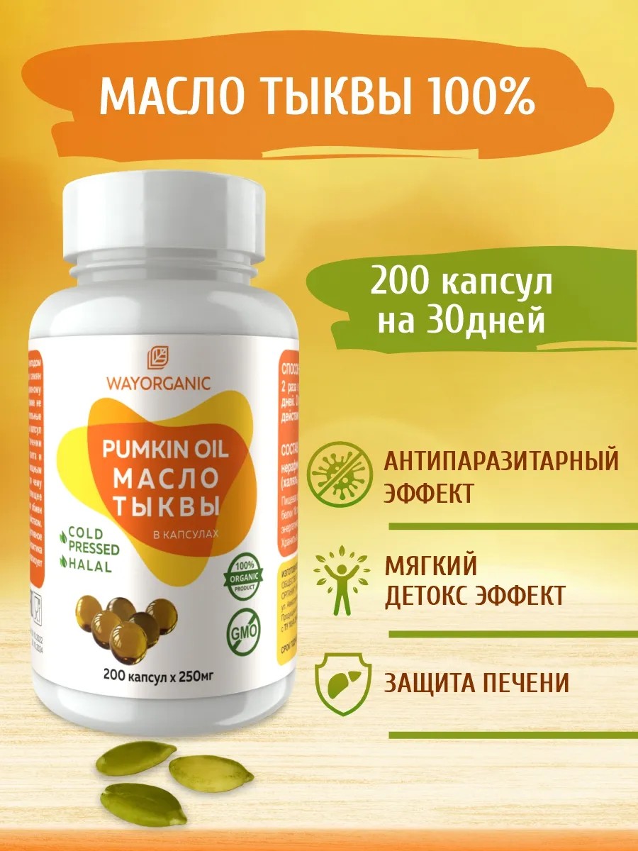 Масло тыквы торговой марки WAYORGANIC изготовлено методом холодного прессования из отборных семян голосемянной тыквы. Благодаря бережному производству масла , температура при отжиме не превышает +25 градусов, сохраняются все питательные нутриенты в продукте. Форма желатиновых капсул позволяет сохранить эту пользу в течении длительного срока, без попадания света и кислорода. Тыквенное масло обладает мощным антиоксидантным свойством, благодаря чему оказывает на организм общеукрепляющее действие, повышает иммунитет и ускоряет обмен веществ. Обладает антипаразитарным свойством. Стимулирует мужское и женское репродуктивное здоровье. Содержит большое количество витаминов группы B, A, цинк, селен и др. Профилактика сердечно- сосудистых заболеваний. Нормализует работу ЖКТ и печени.