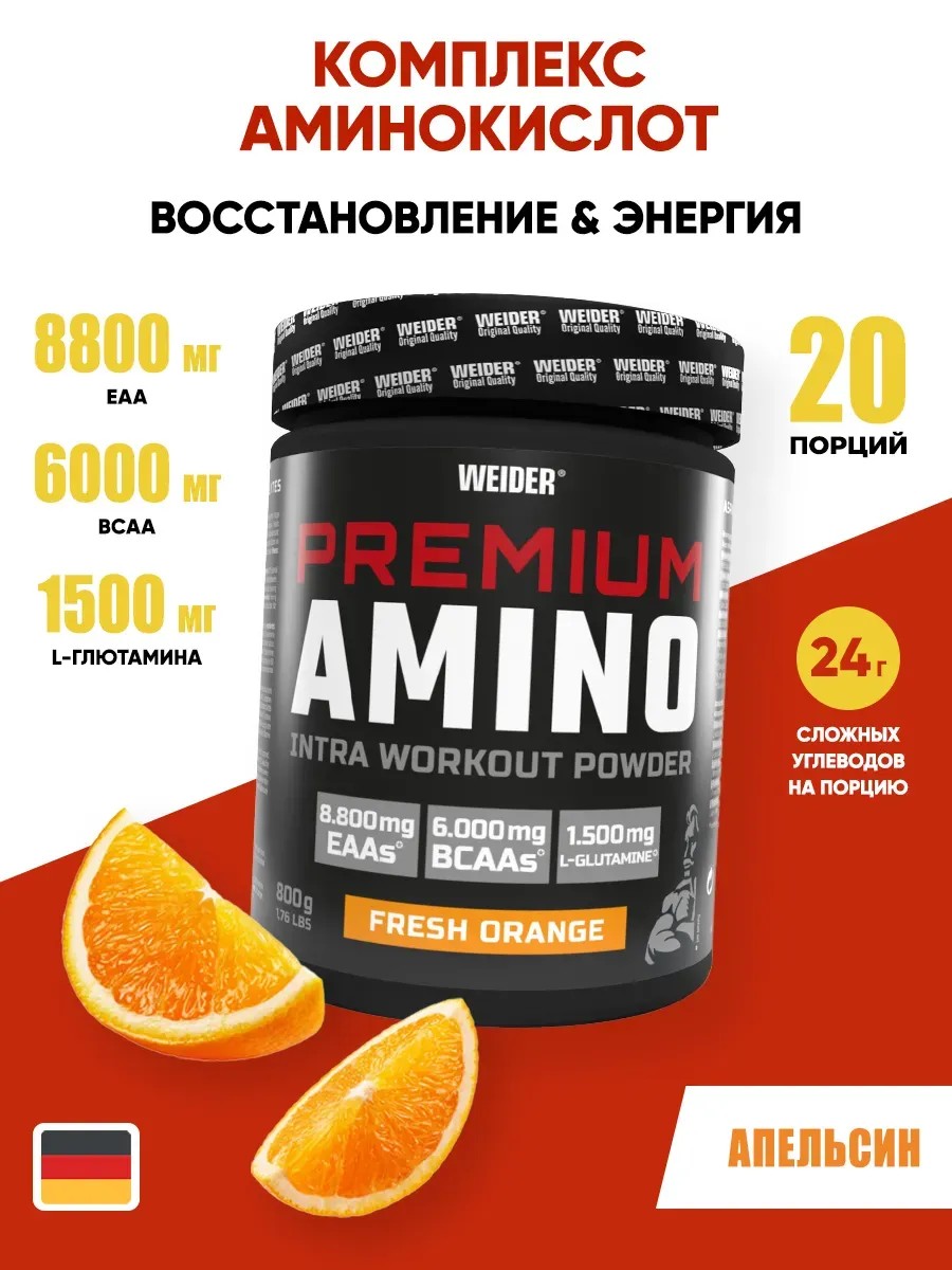 Пищевая добавка Premium Amino — это премиальный аминокислотный комплекс на основе незаменимых кислот EAA, BCAA и L-глютамина. Тщательно продуманный состав компонентов, дополненный высококачественными углеводами и необходимыми организму электролитами, превосходно поддержит вас во время регулярных интенсивных тренировок. Вкусный апельсиновый напиток Premium Amino обеспечивает организм именно теми питательными веществами, в которых вы нуждаетесь на этапе активного движения к спортивным целям.EAA (8,8 г в порции) — незаменимые аминокислоты, необходимые организму для синтеза белка. ЕАА помогают увеличивать объем и силу мышц, снижают интенсивность и продолжительность катаболических процессов, препятствуют быстрому наступлению усталости.