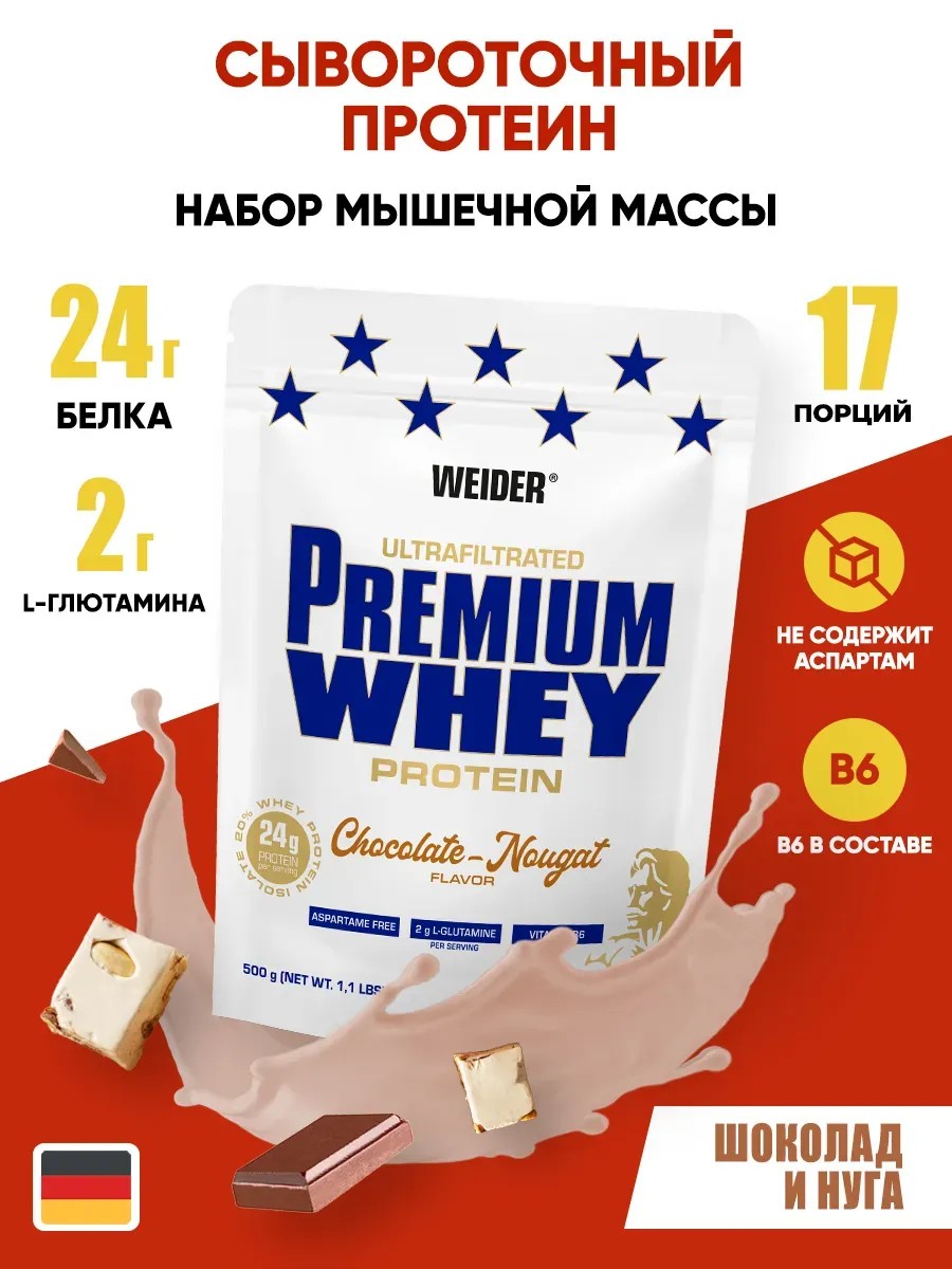 Продукт представляет собой сбалансированный микс двух видов быстроусвояемого протеина: изолята и концентрата в соотношении 1:4. Концентрат содержит более 75% высококачественного белка, а изолят — более 85% как наиболее чистая форма. Изолят сывороточного протеина получен с помощью нескольких этапов микрофильтрации и свободен от лишних жиров, углеводов и лактозы. Добавка позволяет полностью покрыть повышенную потребность организма в белке. Порция напитка Premium Whey со вкусом шоколад с нугой содержит целых 25 г белка высочайшего качества, 2 г аминокислоты Л-глютамин и витамин В6.