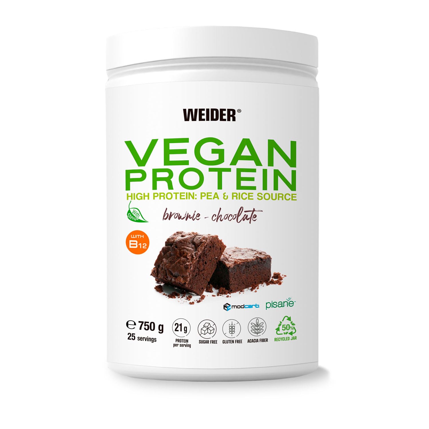 INGREDIENTS pea protein isolate (81 ), lean cocoa powder, rice protein concentrate (3 ), flavouring, grain and seed mixture (OAT bran (GLUTEN FREE), quinoa, amaranth, buckwheat, millet), acacia fiber, maltodextrin, sweetener (enzymatically produced steviol glycosides), Vitamin B12 (methylcobalamin) INSTRUCTIONS FOR USE Recommended daily use: 1 serving. LEGAL DISCLAIMER Food supplements are not a substitute for a balanced and varied diet. See moreWeider Vegan Protein (750g) Brownie - Chocolate - Eiwitten - Veganistisch eiwit Brownie - Chocolate 750g INGREDIËNTEN erwteneiwit-isolaat(81 ), mager cacaopoeder, rijstproteïne-concentraat(3 ), aroma, graan- en zadenmengsel( HAVERZEMELEN (GLUTENVRIJ), quinoa, amarant, boekweit, gierst), acacia-vezels, maltodextrine, zoetstof( enzymatisch geproduceerde steviolglycosiden), Vitamine B12( methylcobalamine) GEBRUIKSAANWIJZING Aanbevolen dagelijks gebruik: 1 portie. WETTELIJKE DISCLAIMER Voedingssupplementen zijn geen vervanging voor een evenwichtige en gevarieerde voeding. Meer bekijken