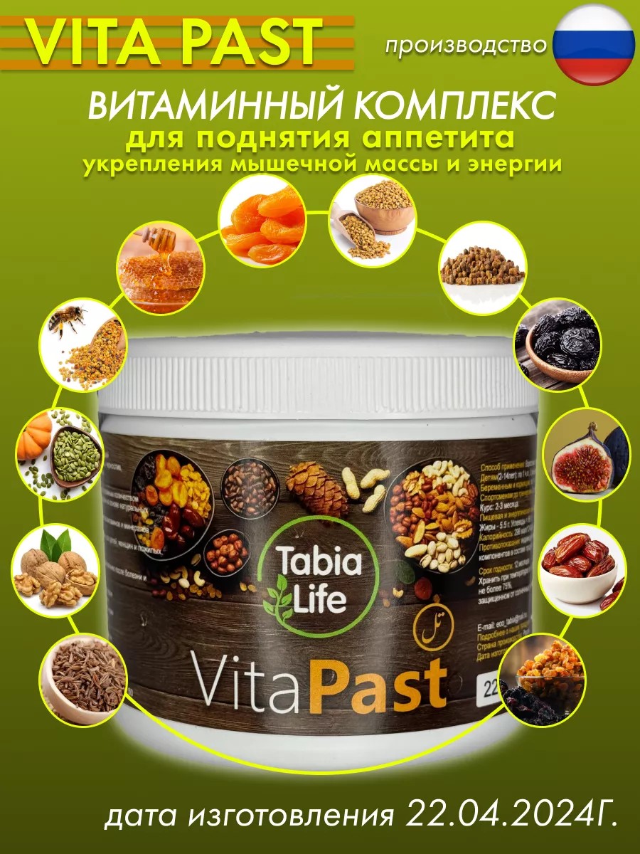 VITA past is a vitamin paste with a huge amount of nutrients. The product is made on the basis of natural ingredients. The mixture contains a huge amount of vitamins and minerals necessary for the body. Suitable for athletes, children, women and the elderly. Promotes: improved gastrointestinal tract function; strengthening the immune system and recovery after illness and physical exertion; increased appetite; strengthening muscle mass and energy; enhances male and female potency, is good for vision, teeth, hair and skin; maintains health and beauty. Not a medicine. Ingredients: honey, bee bread, caraway seeds, walnuts, pollen, pumpkin seeds, prunes, dates, fenugreek, dried apricots, figs, raisins. Directions for use: Adults: 1 tbsp 3 times daily with meals. Children aged 2 to 14: 1 tsp 3 times daily with meals. Pregnant and lactating women: 1 tsp 3 times daily with meals. Athletes before training: 2 tbsp after meals. Course 2-3 months Nutritional and energy value per 100 g: Proteins - 5.9 g. Fats - 5.5 g. Carbohydrates - 56.1 g. Calories: 296 kcal / 1240 kJ. Contraindications: individual intolerance to the components in the product for weight loss from excess weight.