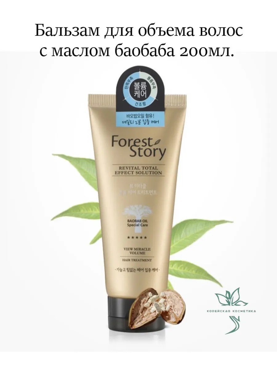 Бальзам для объема волос Forest Story View Miracle Volume Hair Treatment Бальзам для ухода за тонкими волосами и придания объема на каждый день. Масло баобаба, богатое омега-6, витаминами А, D, Е и С, питает. Жительницы Африки издревле использовали масло баобаба для защиты своих волос и кожи. Гидролизованный кератин восстанавливает, облегчает расчесывание и создает особый слой против электризации волос. Способ применения: после использования шампуня нанесите бальзам на влажные волосы и распределите его по всей длине волос. Подержите 1-3 минуты, а затем смойте теплой водой.