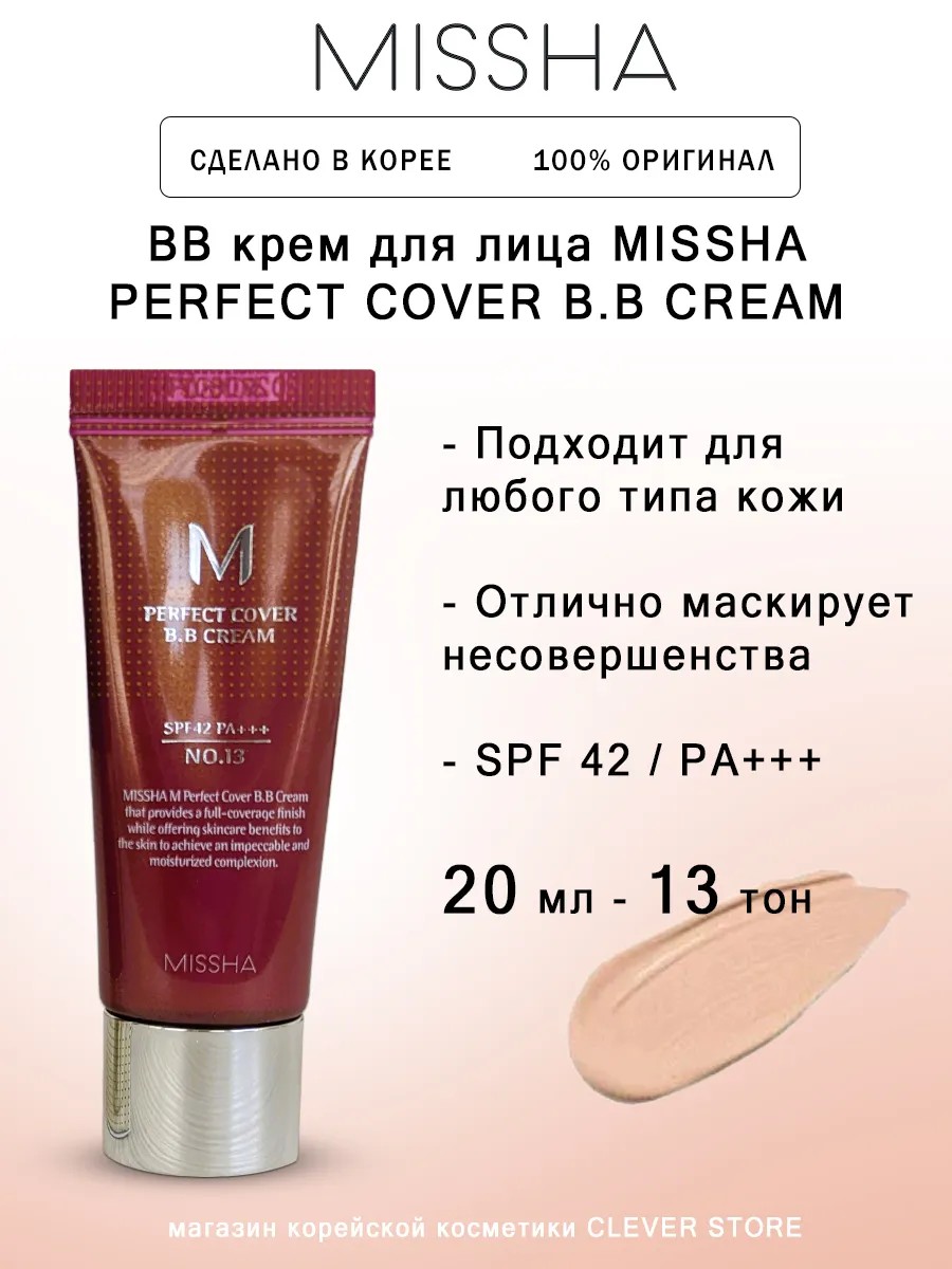 Обладает превосходными маскирующими качествами, хорошей стойкостью (более 12 часов), защита от УФ-излучения и хорошим ухаживающим составом. Несет в себе функции тонального крема и консилера, поскольку очень плотный, имеет защиту от солнца СПФ 42, а также хорошо увлажняет кожу и борется с воспалениями. Самый известный и самый популярный крем MISSHA M Perfect Cover BB Cream.