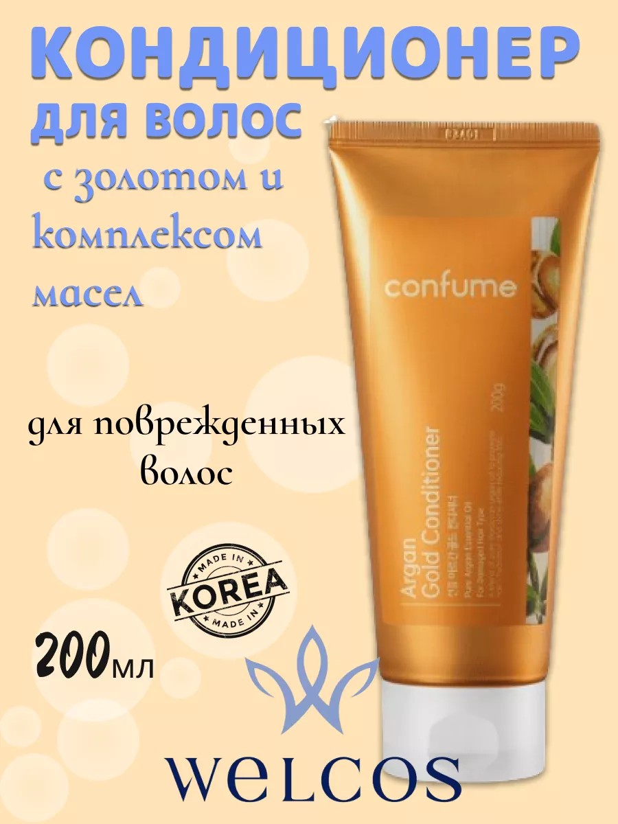 Кондиционер для волос с золотом и комплексом масел WELCOS Confume Gold Conditional увлажняет и питает волосы, делая их более гладкими и шелковистыми, придает им эластичность и невероятный блеск. Насыщает волосяной стержень витаминами и другими питательными веществами, укрепляя изнутри, облегчает расчесывание непослушных прядей. Кондиционер для восстановления волос с микрочастицами золота и маслом арганы. Обогащен комплексом растительных экстрактов и драгоценных масел. Идеально подойдёт для поврежденных волос, придает им шелковистость, эластичность и невероятный блеск. Коллаген и эластин увлажняют волосы по всей длине, дарят им блеск, шелковистость и здоровый внешний вид. Облегчает расчесывание и защищает волосы от негативного воздействия окружающей среды, термического и механического воздействия. Коллаген и эластин увлажняют волосы по всей длине, дарят им блеск, шелковистость и здоровый внешний вид.