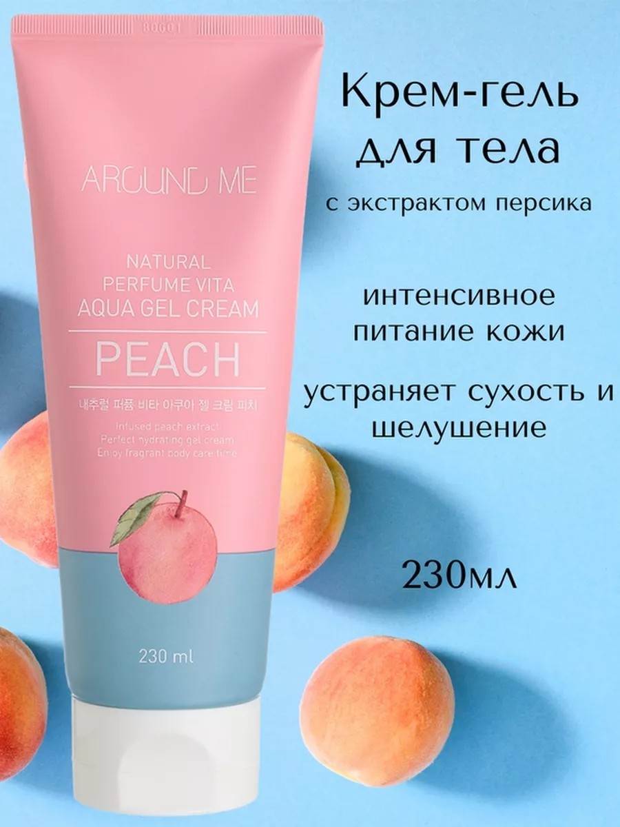 Around me Natural Perfume Vita Aqua Gel Cream Peach (230 ml) perfectly nourishes, moisturizes, and tones the skin, making it more elastic, supple, and soft. This product eliminates dryness, irritation, and flaking, preventing premature aging of the skin.