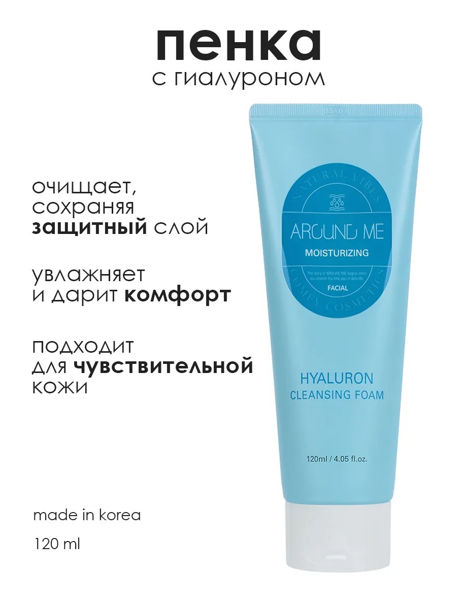 Around Me Moisturizing Hualuron Cleansing Foam Увлажняющая очищающая пенка с гиалуроном отлично очищает кожу от излишков себума, пыли, остатков макияжа и других загрязнений, при этом не повреждает защитный слой кожи. Средство поддерживает оптимальный уровень увлажнения, защищает кожу от обезвоживания, содержит полезные компоненты. Подходит для чувствительной кожи.Применение: нанесите средство на ладонь и вспеньте с небольшим количеством воды, аккуратно распределите пенку по лицу, очистите кожу массирующими движениями, а затем умойтесь теплой водой.