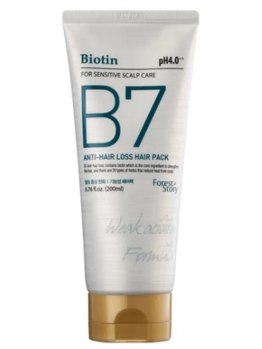 Welcos Forest Story B7 Anti-Hair Loss Hair Pack (200g) is a gentle treatment for sensitive scalps. This anti-hair loss mask contains biotin and natural active ingredients that help eliminate hair breakage and stimulate growth, strengthen roots, normalize scalp metabolism, and improve circulation. Biotin regulates sebum production, eliminates dandruff, and improves scalp condition. Directions: Apply the mask to clean, damp hair along the entire length, leave on for 2-3 minutes, then rinse thoroughly. Ingredients: Water, Cetyl Alcohol, Stearyl Alcohol, Amodimethicone, Behentrimonium Chloride, Butylene Glycol, Isopropyl Alcohol, Ceteth-20, Panthenol, Stearyl Stearate, Fragrance, Zinc Pyrithione, Salicylic Acid, Sodium Benzoate, Laureth-5, Zinc Chloride, Argania Spinosa Kernel Oil, Oryza Sativa (Rice) Bran Oil, Hydrolyzed Collagen, Disodium EDTA, Alpha-Isomethyl Ionone, Dipotassium Glycyrrhizate, Butylphenyl Methylpropional, Linalool, Geraniol, Sodium Polynaphthalenesulfonate, Citronellol, Hexyl Cinnamal, Arginine, Biotin, Citric Acid, Phenoxyethanol, Limonene, Coumarin, 1,2-Hexanediol, Gelatin, Hydrolyzed Keratin, Hydrolyzed Corn Protein, Hydrolyzed Soy Protein, Hydrolyzed Wheat Protein, Hydroxypropyl Cyclodextrin, Ethyl Hexanediol, Brassica Oleracea Italica (Broccoli) Sprout Extract, Angelica Gigas Root Extract, Camellia Sinensis Leaf Extract, Curcuma Longa (Turmeric) Root Extract, Eclipta Prostrata Extract, Polygonum Multiflorum Root Extract, Scutellaria Baicalensis Root Extract, Swertia Japonica Extract, Thuja Orientalis Leaf Extract, Carthamus Tinctorius (Safflower) Flower Extract, Forsythia Suspensa Fruit Extract, Ginkgo Biloba Leaf Extract, Glycine Soja (Soybean) Seed Extract, Glycyrrhiza Uralensis (Licorice) Root Extract, Panax Ginseng Root Extract, Schisandra Chinensis Fruit Extract, Zingiber Officinale (Ginger) Root Extract, Acorus Gramineus Extract, Artemisia Princeps Leaf Extract, Chrysanthemum Zawadskii Extract, Cornus Officinalis Fruit Extract, Ficus Carica (Fig) Fruit Extract, Ganoderma Lucidum (Mushroom) Extract, Houttuynia Cordata Extract, Sophora Flavescens Root Extract, Avena Sativa (Oat) Kernel Extract, Aspergillus Ferment.