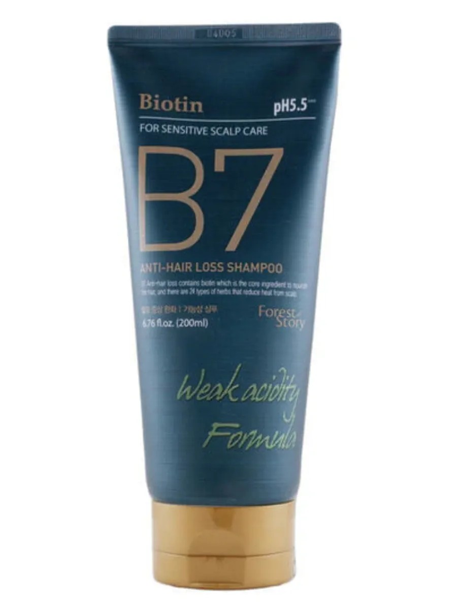 Welcos Forest Story B7 Anti-Hair Loss Shampoo with Biotin, 200ml. This pH-balanced shampoo with a gentle cleansing base provides high-quality hygienic care for hair and scalp. Thanks to a bioactive complex with biotin, plant extracts and proteins, salicylic acid, and other beneficial ingredients, this shampoo actively strengthens roots, stops hair loss, soothes and heals the skin, and gives hair strength, elasticity, and beautiful shine. The formula regulates sebum production, prevents the development of pathogenic microflora and dandruff, stimulates cellular renewal, and promotes strong hair growth. Directions: Wet hair with warm water and apply shampoo, then gently massage it into scalp. Rinse with warm water. For best results, repeat. Ingredients: Water, Sodium Laureth Sulfate, Glycerin, Butylene Glycol, Cocamide MEA, Sodium Lauroyl Methylaminopropionate, Coco-glucoside, Cocamidopropyl Betaine, Lauric Acid, Cocamidopropyl Hydroxysultaine, Panthenol, Salicylic Acid, Niacinamide, Biotin, Hydrolyzed Collagen, Gelatin, Hydrolyzed Keratin, Avena Sativa (Oat) Kernel Extract, Hydrolyzed Corn Protein, Hydrolyzed Soy Protein, Hydrolyzed Wheat Protein, Hydroxypropyl Cyclodextrin, Angelica Gigas Root Extract, Camellia Sinensis Leaf Extract, Curcuma Longa (Turmeric) Root Extract, Eclipta Prostrata Extract, Polygonum Multiflorum Root Extract, Scutellaria Baicalensis Root Extract, Swertia Japonica Extract, Thuja Orientalis Leaf Extract, Carthamus Tinctorius (Safflower) Flower Extract, Forsythia Suspensa Fruit Extract, Ginkgo Biloba Leaf Extract, Glycine Soja (Soybean) Seed Extract, Glycyrrhiza Uralensis (Licorice) Root Extract, Panax Ginseng Root Extract, Schisandra Chinensis Fruit Extract, Zingiber Officinale (Ginger) Root Extract, Brassica Oleracea Italica (Broccoli) Sprout Extract, Acorus Gramineus Extract, Artemisia Princeps Leaf Extract, Chrysanthemum Zawadskii Extract, Cornus Officinalis Fruit Extract, Ficus Carica (Fig) Fruit Extract, Ganoderma Lucidum (Mushroom) Extract, Houttuynia Cordata Extract, Sophora Flavescens Root Extract, Aspergillus Ferment, Zinc Pyrithione, Menthol, Polyquaternium-10, Carbomer, Polyquaternium-7, Zinc Chloride, Betaine, Ceteareth-60 Myristyl Glycol, Erythritol, Sodium Polynaphthalenesulfonate, Capric Acid, Myristic Acid, Sodium Chloride, Sodium Hydroxide, Citric Acid, Disodium EDTA, Sodium Benzoate, 1,2-Hexanediol, Ethyl Hexanediol, Fragrance, Alpha-Isomethyl Ionone, Butylphenyl Methylpropional, Linalool, Geraniol, Citronellol, Hexyl Cinnamal.