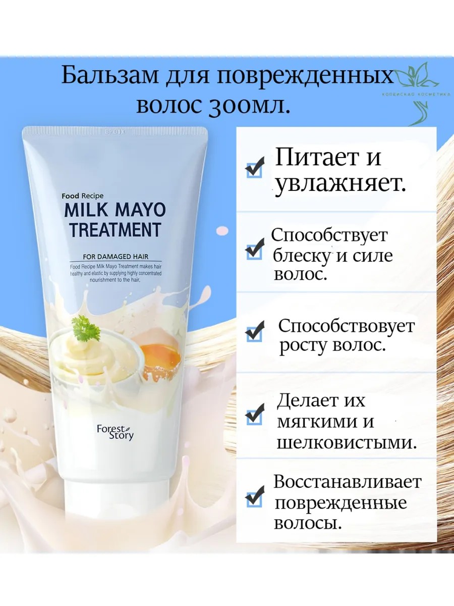 Бальзам для поврежденных волос Forest Story Food Recipe Milk Mayo Treatment, с нежным молочным ароматом ухаживает за поврежденными волосами. Майонез (оливковое масло, яичный желток и уксус) проникает глубоко в волосы, чтобы напитать и увлажнить их. Богатый питательными веществами протеин из экстракта молока делает волосы более здоровыми и крепкими. Способ применения: после использования шампуня нанесите бальзам на влажные волосы и распределите его по всей длине волос. Подержите 1-3 минуты, а затем смойте теплой водой.