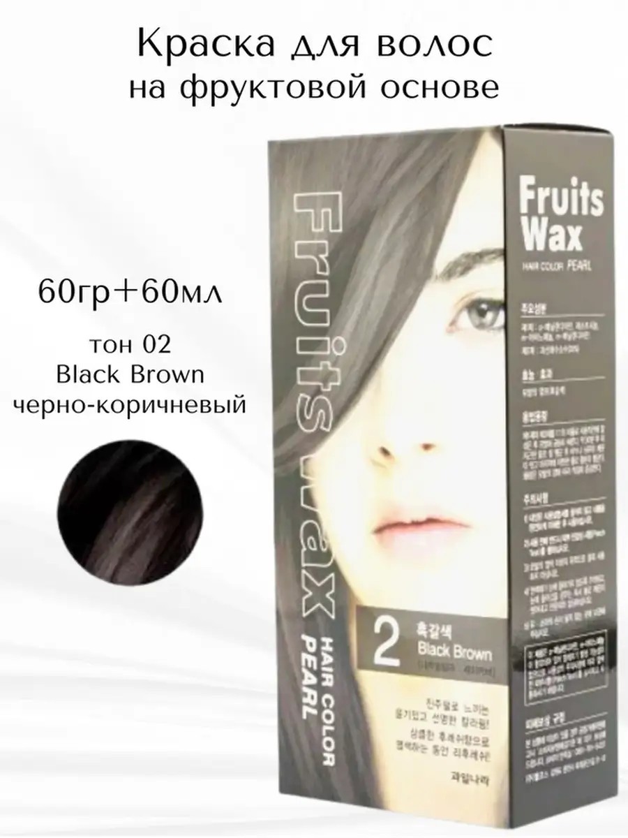 Fruits Wax Pearl Hair Color. Краска для волос корейская на фруктовой основе тон темный шоколад или черно-коричневый , эффективно закрашивает седину, стойко держится, сохраняет здоровье волос. Жемчужный экстракт бережет волос от сечения, придает блеск. Натуральные фруктовые воски и масло пенника лугового покрывают слой кутикулы ваших волос. Кремовая текстура, глубоко проникает в волос. Имеет освежающий цветочный аромат. ОТТЕНКИ: 02 Black Brown ПРИМЕНЕНИЕ: Смешать содержимое 1:1, нанести на сухие волосы на 30-40 минут, затем смыть водой и шампунем. Окрашивание корней: Нанести краску, оставить на 15-20 минут, затем распределить краску равномерно по всей длине волос и оставить еще на 15-20 минут, вымыть волосы шампунем.