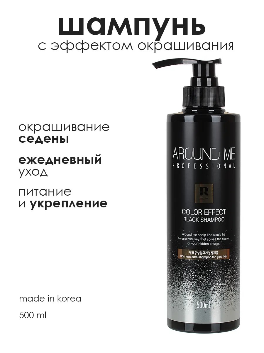 Around Me Color Effect Black Shampoo Шампунь с эффектом окрашивания для ухода за волосами с сединой. Профессиональная линия средств Around Me Color оказывает быстрый и легкий ежедневный уход за волосами и их цветом. Комплекс черных ингредиентов (черная фасоль, семена черного кунжута, черный рис, черный чеснок) способствуют росту волос, предотвращают выпадение, яблочный уксус помогает поддерживать натуральный цвет волос. Максимальный эффект при использовании двух средств шампуня и кондиционера. Способ применения: равномерно нанесите средство на корни и по всей длине волос, оставьте средство на 2-3 минуты на коротких волосах, на 3-5 минут на длинных волосах, тщательно смойте теплой водой.
