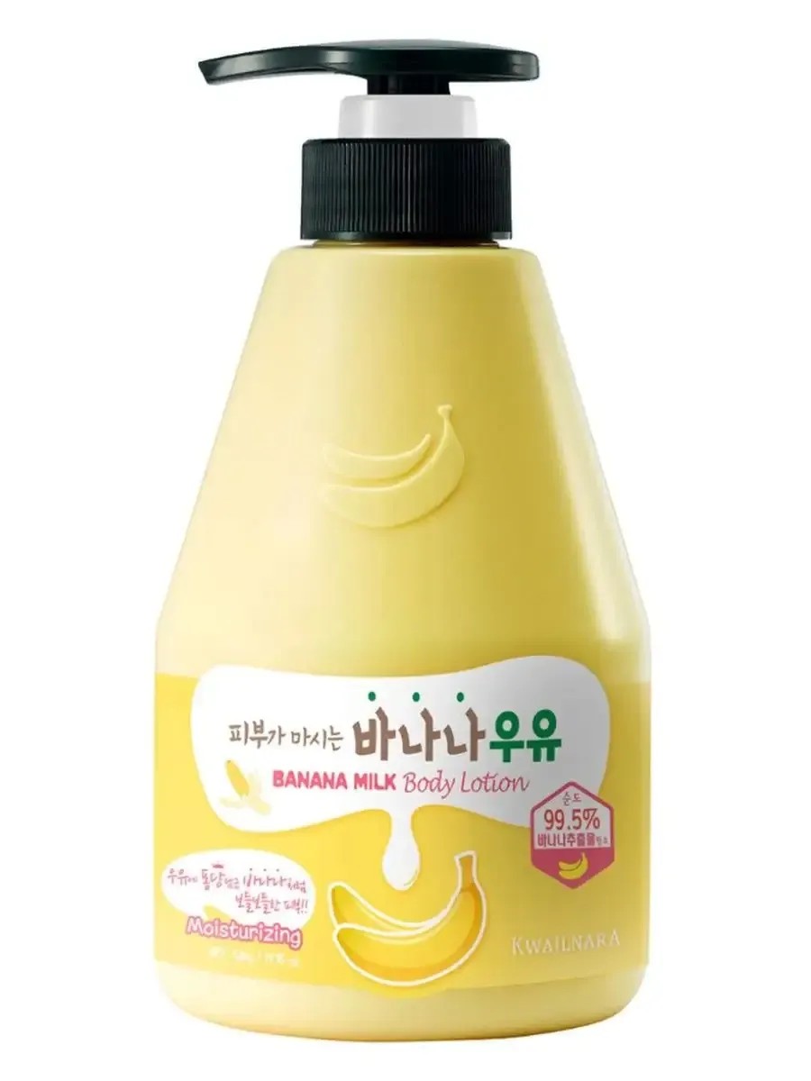 Welcos Kwailnara Milk Body Banana Lotion Banana Flavor Body Lotion 560ml. This nourishing body lotion provides long-lasting hydration, soothes, and protects sensitive skin. After use, your skin will feel smooth, supple, and pleasant to the touch. The lotion has a light, pleasant scent that will linger throughout the day. Its light, weightless texture is instantly absorbed without leaving a greasy, sticky film. It does not cause irritation or redness. With regular use: relieves itching and irritation; is quickly absorbed and provides excellent hydration; helps restore the skin's natural barrier function; and improves skin firmness and elasticity. The lotion instantly soothes the skin, deeply nourishes and moisturizes, eliminates dryness and flaking, improves skin firmness and elasticity, tones, accelerates cell regeneration, and combats skin aging. Directions: Apply lotion to skin and massage in. Ingredients: Water, Mineral Oil, Glycerin, Butylene Glycol, Caprylic/Capric Triglyceride, Cetearyl Alcohol, Phenoxyethanol, Dimethicone, Arachidyl Alcohol, Sorbitan Sesquioleate, Fragrance, Chlorphenesin, Behenyl Alcohol, Glyceryl Stearate, PEG-100 Stearate, Arachidyl Glucoside, Carbomer, Musa Sapientum (Banana) Fruit Extract, Potassium Hydroxide, Xanthan Gum, Panthenol, Disodium EDTA, Alcohol, Honey Extract, Tris (Tetramethylhydroxypiperidinol) Citrate, CI 19140, CI 15985, Milk Protein Extract, Propolis Extract, Royal Jelly Extract.