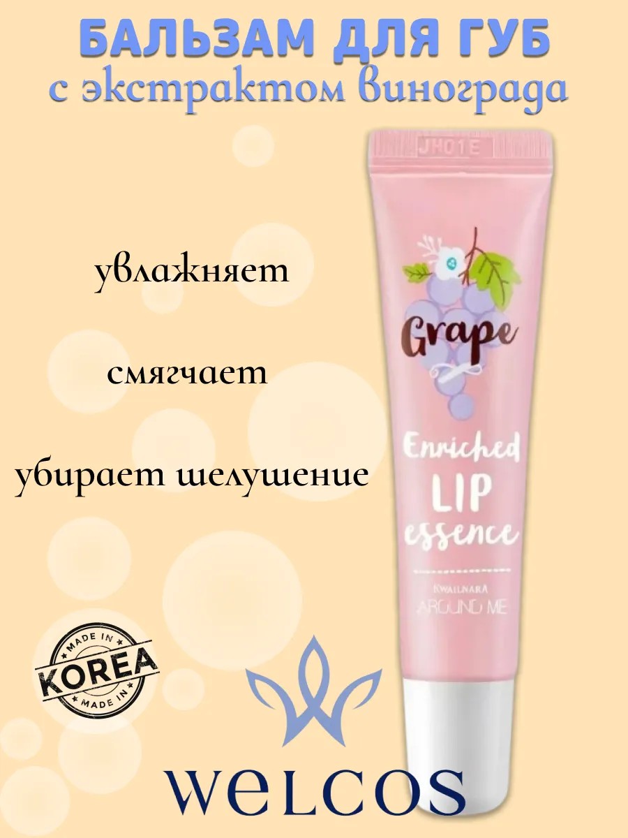 Бальзам для губ Welcos Around Me Enriched Lip Essence Grape - средство для ухода за кожей губ, незаменимо в любое время года: летом убережет кожи от пересушивания ультрафиолетом, осенью защитит от обветривания, зимой уменьшит негативное воздействие мороза, а весной – восполнит недостаток витаминов. Благодаря эссенции, кожа губ будет мягкой, гладкой и шелковистой.