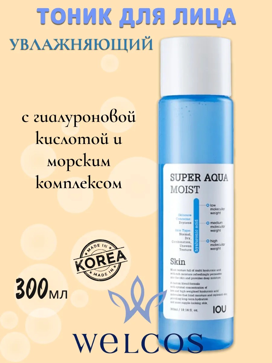 Увлажняющий тоник для лица Welcos IOU Super Aqua Moist Skin увлажняет кожу, моментально снимает стянутость, дарит коже комфорт и свежесть, регулирует водно-жировой баланс кожи. Стимулирует синтез коллагена и эластина, помогает значительно улучшить состояние кожи, обновить, ускорить ее регенерацию.