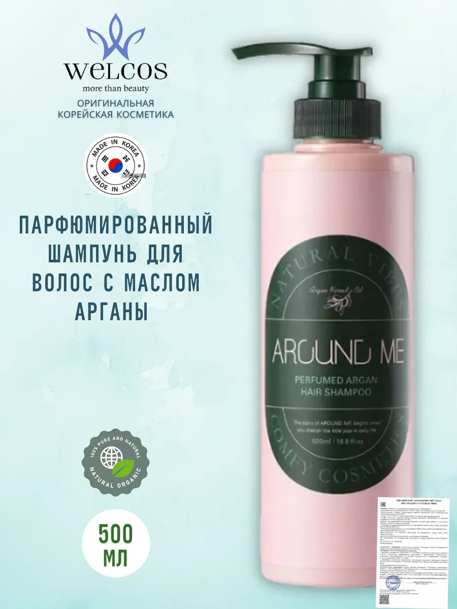 Introducing Around Me Perfumed Argan Hair Shampoo (500ml) from the Korean brand WELCOS. Restore your hair's strength and shine with a shampoo enriched with precious argan oil! This shampoo is a true salvation for damaged, dull, and brittle hair in need of intensive care.