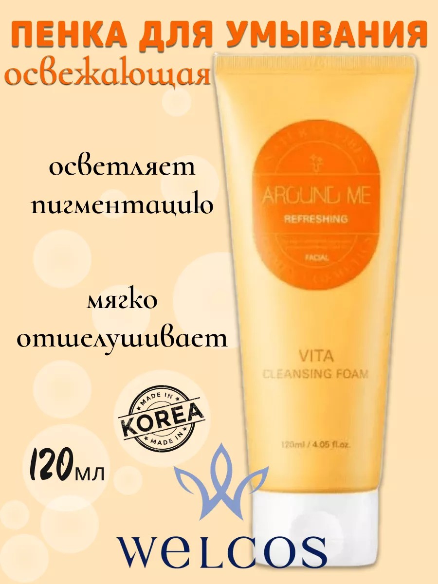 Освежающая пенка для умывания Around Me Refreshing Vita Cleansing Foam - освежающая пенка с высоким содержанием витаминов и выраженным антиоксидантным действием идеально подходит для очищения тусклой, уставшей кожи. Средство нежно, но эффективно растворяет излишки себума, остатки макияжа и загрязнения, способствует мягкому отшелушиванию кожи, борется с нежелательной пигментацией (веснушки, пигментные пятна, постакне и др), улучшает тон и текстуру кожи, придает сияние. Мягкая формула с ниацинамидом и натуральными экстрактами сохраняет кожу увлажненной без ощущения сухости и стянутости. Эффективное очищение кожи лица без механических повреждений, высушивания и ощущения дискомфорта дарит Умывашка от корейского бренда Welcos предназначена для ежедневного ухода за любым типом кожи. В ее составе натуральные компоненты, питающие кожу, придающие ей свежий вид и снимающие раздражение.