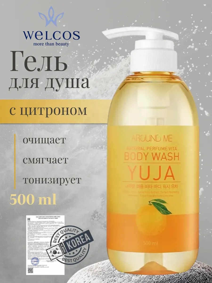 | Комплектация | Гель для душа с экстрактом цитрона Welcos Around Me Natural Perfume Vita Body Wash Yuja 500мл; корейский гель для тела |