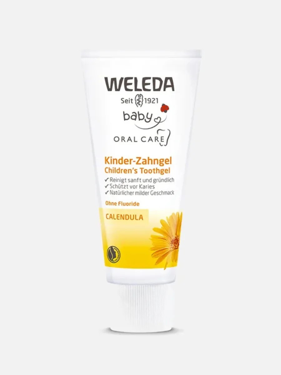 Contains only natural ingredients. Regular brushing with children's tooth gel with calendula removes plaque and naturally protects baby's baby teeth from cavities.