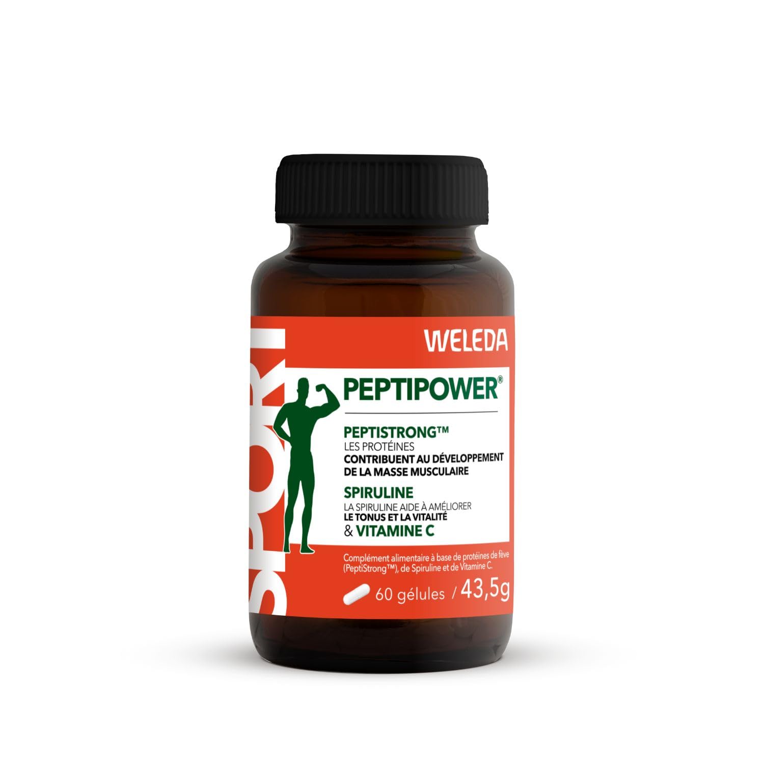 : OPTIMIZED MUSCLE TONE: PeptiPower combines hydrolyzed fava bean protein PeptiStrong™, organic spirulina, and vitamin C. It helps develop strength, support recovery, and restore tone and vitality, complementing your daily sports activities. FLEXIBLE DOSAGE: 4 TO 8 CAPSULES: 7 to 15-day program: Attack phase: 8 capsules day (4 in the morning, 4 at midday) with a glass of water. Maintenance phase: 4 capsules day (2 in the morning, 2 at midday). Box of 60 capsules, 43.5 g, to adjust the duration according to your goals. SUGAR-FREE VEGAN FORMULA: Sugar-free vegan formula: fava bean protein, certified organic spirulina FR-BIO-01, vitamin C, pullulan vegetable capsule. Lactose-free, gluten-free, colorant-free, and free of animal-derived ingredients. Made in France. CLINICALLY TESTED: Bean peptides act as highly bioavailable and digestible micro-proteins for optimal absorption. Three clinical studies have shown a significant effect on muscle mass, with visible results in strength, recovery, and tone. "WELEDA EXPERTISE SINCE 1921: A pioneer in natural cosmetics and a certified B Corp™, the Swiss laboratory Weleda draws on over 100 years of expertise in creating natural skincare with proven efficacy. Inspired by Celtic prophetesses, experts in plants, the name Weleda reflects its commitment to harmonious health and beauty, respectful of Nature and humankind. Each Weleda formula is carefully crafted with plant-based active ingredients, primarily sourced from organic farming and biodynamic gardens around the world. Free from preservatives and synthetic fragrances, these products preserve the purity of the ingredients while offering a unique sensory experience. Certified by NATRUE, a symbol of naturalness, quality, and sustainability, Weleda products meet the needs of the whole family. From face and body to maternity, baby care, and massage oils, each creation is designed to Hydrate, soothe, or revitalize, while respecting the skin's natural balance at every stage of life. Ingredients: Hydrolyzed fava bean protein powder Organic spirulina powder (FR-BIO-01) (Spirulina platensis (Gomont) Geitler) Capsule shell: pullulan L-ascorbic acid (vitamin C). P.when('A').execute(function(A) { A.on('a:expander:toggle_description:toggle:collapse', function(data) { window.scroll(0, data.expander. expander[0].offsetTop-100) }) }) Safety Warning: Keep out of reach of young children. See moreWELEDA EXPERTISE SINCE 1921: A pioneer in natural cosmetics and a certified B Corp laboratory, Weleda combines 100 years of expertise and sustainability to create natural skincare products with proven effectiveness, such as our PeptiPower food supplement. VEGAN, SUGAR-FREE FORMULA: Hydrolyzed fava bean protein, certified organic spirulina (FR-BIO-01), vitamin C, vegetable pullulan capsule. Weleda food supplement free from lactose, gluten, and colorings, and without ingredients of animal origin made in France. FLEXIBLE DOSAGE: 4 TO 8 CAPSULES: For a 7- to 15-day program: Loading phase: 8 capsules per day (4 in the morning, 4 at midday) with a glass of water. Maintenance phase: 4 capsules per day (2 in the morning and 2 at midday) with a glass of water. CLINICALLY TESTED: Fava bean peptides act as micro-proteins. They are highly bioavailable, easily digestible, and allow for optimal absorption. Three clinical studies have demonstrated a significant effect on muscle mass. OPTIMIZED MUSCLE TONE: PeptiPower is a food supplement based on hydrolyzed fava bean proteins, organic spirulina, and vitamin C. It helps develop muscle strength, improve recovery, and restore tone and vitality.Description du produit MUSCLE TONUS OPTIMISÉS : PeptiPower associe protéines hydrolysées de fève PeptiStrong™, spiruline bio et vitamine C. Il aide à développer la force, soutenir la récupération et retrouver tonus et vitalité, pour accompagner la pratique sportive au quotidien. POSOLOGIE FLEXIBLE 4 À 8 GÉLULES : Programme 7 à 15 jours : Phase d'attaque 8 gélules jour (4 matin, 4 midi) avec un verre d'eau. Phase d'entretien 4 gélules jour (2 matin, 2 midi). Étui 60 gélules, 43,5 g, pour adapter la durée selon vos objectifs. FORMULE VEGAN SANS SUCRES : Formule végane sans sucres : protéines de fève, spiruline bio certifiée FR-BIO-01, vitamine C, gélule végétale en pullulan. Sans lactose, gluten ni colorant, sans ingrédients d'origine animale. Fabriqué en France. CLINIQUEMENT TESTÉ : Les peptides de fèves agissent comme des micro-protéines hautement biodisponibles et digestes pour une assimilation optimale. 3 études cliniques ont montré une action significative sur la masse musculaire pour des résultats visibles sur la force, la récupération et le tonus. "EXPERTISE WELEDA DEPUIS 1921 : Pionnier de la cosmétique naturelle et certifié B Corp™, le laboratoire suisse Weleda s'appuie sur plus de 100 ans de savoir-faire dans la création de soins naturels à l'efficacité prouvée. Inspiré par les prophétesses celtes, expertes des plantes, le nom Weleda reflète son engagement en faveur d'une santé et d'une beauté harmonieuses, respectueuses de la Nature et de l'Être humain. Chaque formule Weleda est soigneusement élaborée avec des actifs végétaux, majoritairement issus de l'agriculture biologique, ainsi que des jardins cultivés en biodynamie à travers le monde. Sans conservateurs ni parfums de synthèse, ces soins préservent la pureté des ingrédients tout en offrant une expérience sensorielle unique. Labellisés NATRUE, symbole de naturalité, de qualité et de durabilité, les soins Weleda répondent aux besoins de toute la famille. Du visage au corps, en passant par la maternité, les soins pour bébé ou les huiles de massage, chaque création est pensée pour hydrater, apaiser ou revitaliser, tout en respectant l'équilibre naturel de la peau à chaque étape de la vie." Ingrédients Poudre de protéines hydrolysées de fève Poudre de spiruline bio (FR-BIO-01) (Spirulina platensis (Gomont) Geitler) En