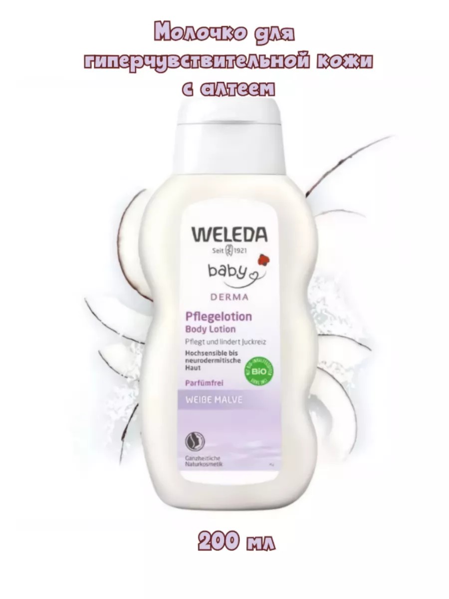 Weleda Молочко для гиперчувствительной кожи тела с алтеем White mallow body lotion нежное питательное средство для ухода за сухой, реактивной кожей детей и взрослых, при атопическом дерматите, 200 мл.