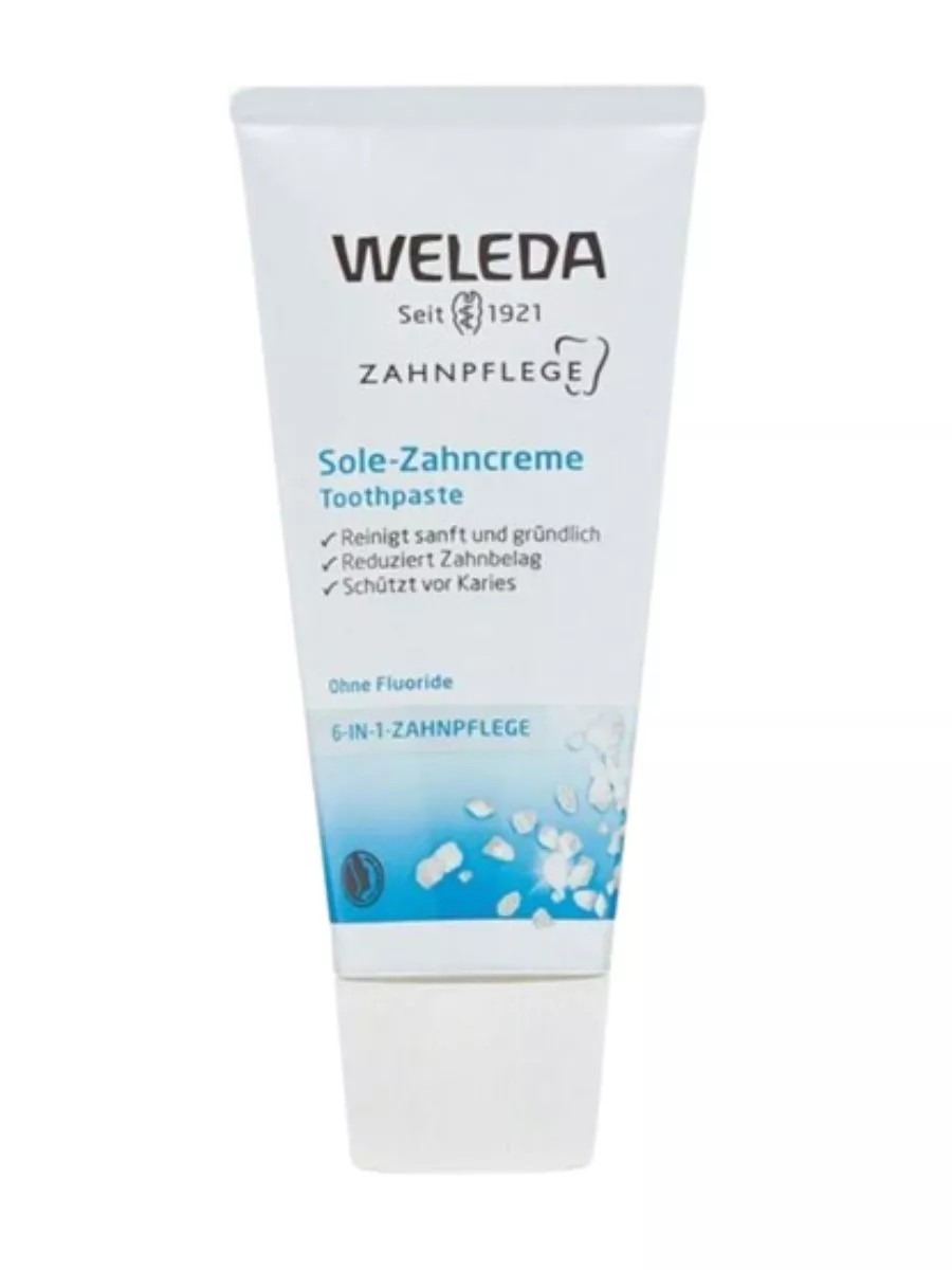 Солевая зубная паста Weleda зубная паста Salt Toothpaste - натуральный продукт для эффективного и бережного отбеливания зубов. В составе солевой зубной пасты присутствует бикарбонат натрия, который нейтрализует кислоты, действующие на эмаль зубов, защищает их от налёта, камня. Компания Weleda добавила в формулу средства экстракты мирры и ратании, что добавило антибактериальный эффект, эффект снятия воспаления внутри полости рта. Salt Toothpaste содержит выжимку из перечной мяты, морскую соль, что придает продукту освежающий, солоноватый, едва терпкий привкус. Не содержит синтетических добавок, окрашивающих веществ, фторидов, отбеливателей.