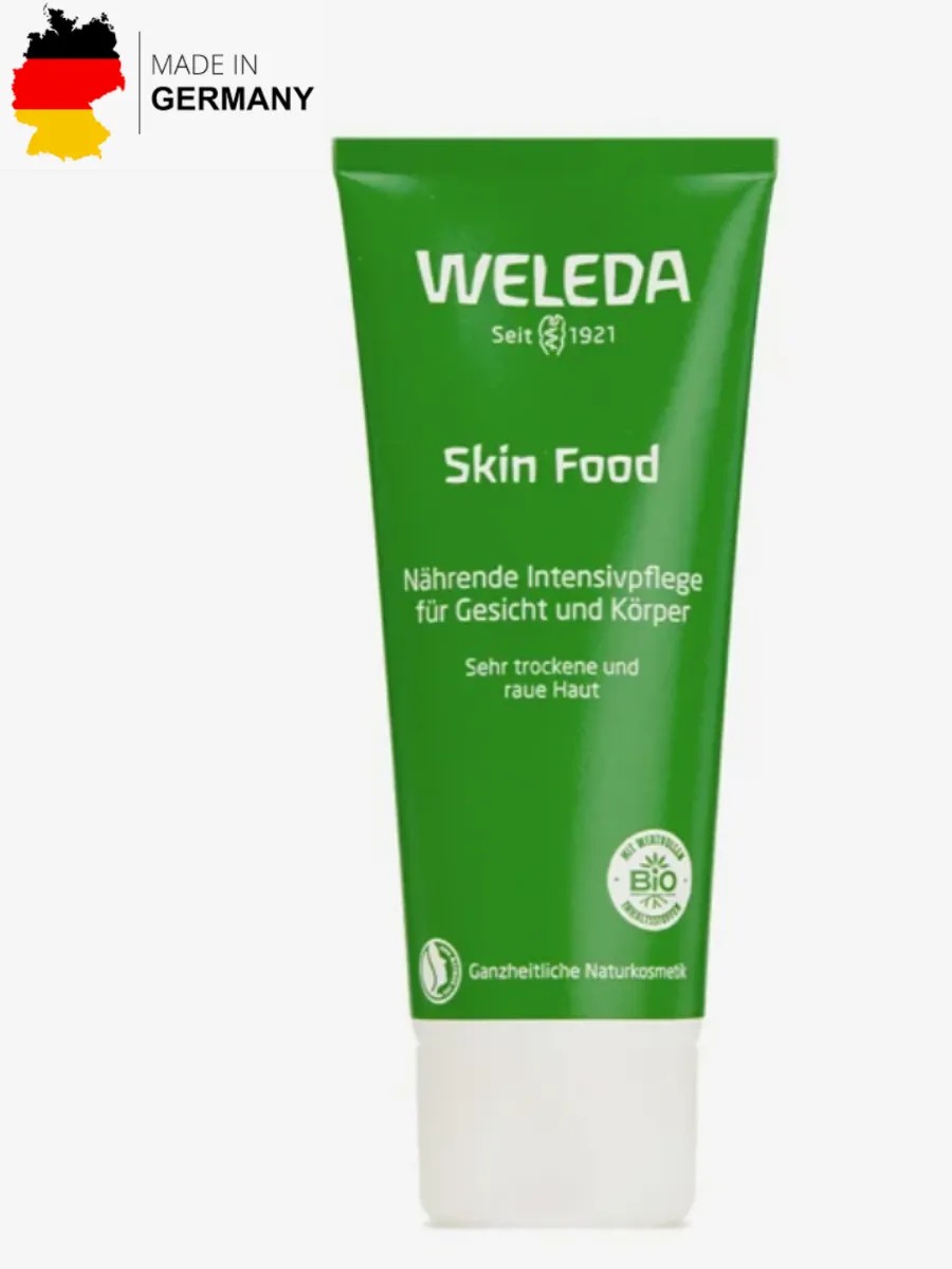 Мультифункциональный крем с насыщенной текстурой и 100% натуральными ингредиентами интенсивно ухаживает за сухой и обезвоженной кожей лица, рук и тела. Английское название «SKIN FOOD» означает «питание для кожи». Созданный в 1926 году, этот продукт продолжает традиции Weleda и с помощью лекарственных растений помогает коже восполнить недостаток питательных веществ. Благодаря особым растительным маслам он глубоко проникает и регенерирует даже огрубевшие участки тела (локти, колени, пятки), а также обеспечивает длительную защиту от ветра и холода. Комплекс успокаивающих экстрактов органической ромашки, календулы и фиалки дарит ощущение комфорта, а тонизирующий экстракт розмарина освежает утомленную и тусклую кожу. В основе нежного аромата – теплые ноты эфирных масел сладкого апельсина и лаванды. Дерматологически протестирован.