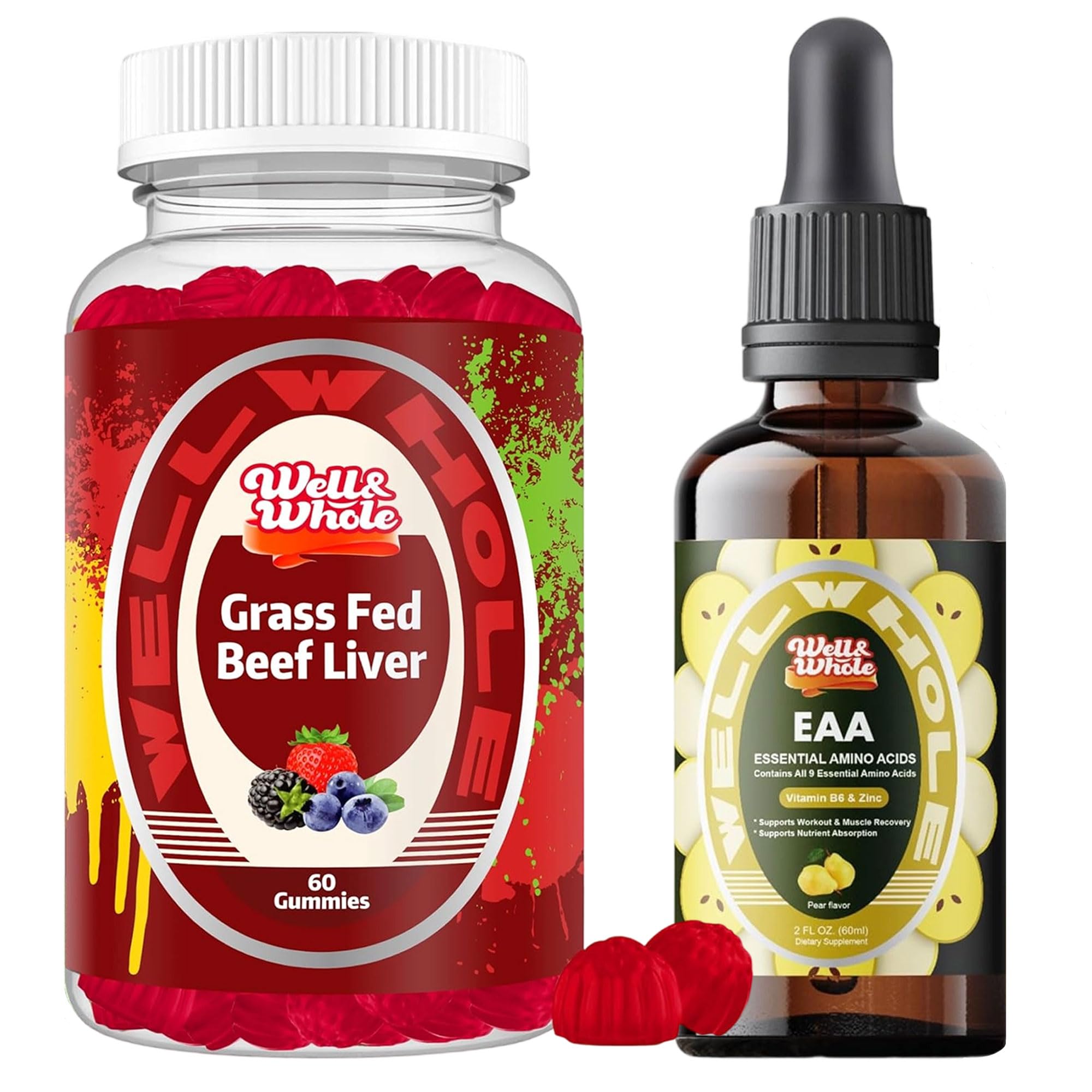 Well&Whole Grass Fed Beef Liver Gummies and Essential Amino Acid (EAA) Liquid Drops & Liver Support Liquid Supplement