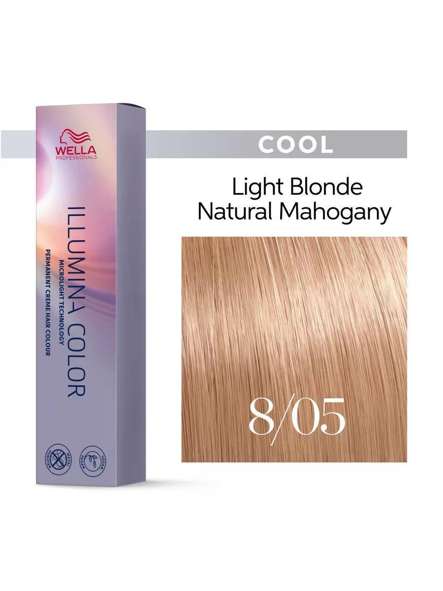 Illumina Color 8/05 light blond natural mahogany. Coloring with ILLUMINA dye gives hair not only a natural, shiny and soft color, but also protects the hair structure. In addition, hair after coloring looks very well-groomed and a stunning hair lamination effect occurs. Thanks to the patented formula, the rays of light can penetrate deep into the hair and create a mirror-like shine and shimmer in any lighting! How to use: To prepare the mixture: mix 60 ml of Illumina Color and 60 ml of Welloxon Perfect (12% - for lightening by 3 levels, 9% - for lightening by 2 levels, 6% - for lightening by 1 tone, as well as for covering gray hair, coloring tone - on - tone or darker). Primary coloring of the entire hair mass tone - on - tone or darker: Apply the coloring mixture along the entire length of the hair from roots to ends. Development time: without heat 30-40 minutes, with heat 15-25 minutes. Toning: mix with Color Touch 1.9% emulsion in a 1:2 ratio. For an even color, comb your hair every 5 minutes during the entire 5-15 minute development time. For a more intense color, use Color Touch 4% emulsion in a 1:1 ratio. Lamination: to create shades that shine in any light, we recommend using Illumina Color in a 1:1:1 ratio. 1 part dye, 1 part Color Touch 1.9% emulsion, and 1 part Wella Professionals Care color stabilizer. Development time is 5-10 minutes.
