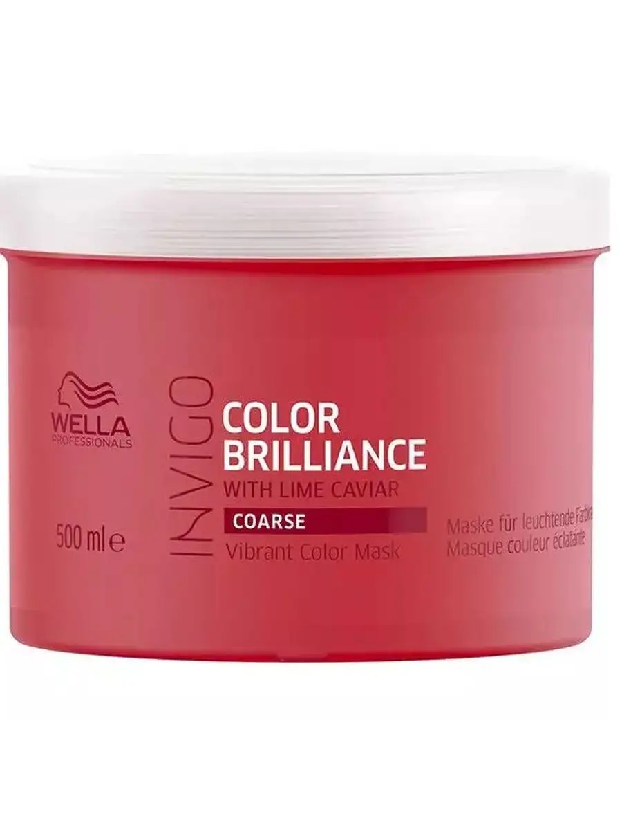 Wella Invigo Color Brilliance Coarse Protection Mask. This color-protecting mask for color-treated, coarse hair intensively conditions, keeping it vibrant and shiny. It smoothes the hair surface, moisturizes, and prevents frizz. Anti-Oxidant Shield technology. With the Color Brilliance Blend formula: Copper-encapsulating molecules maintain brightness. Histidine and vitamin E help control oxidation after coloring and protect color. Lime caviar contains vitamins and antioxidants. Directions: Apply to clean, damp hair. Leave on for 5 minutes. Rinse thoroughly. 500 ml