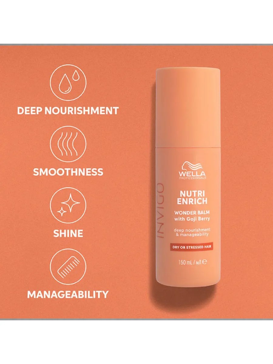 Wella Invigo Nutri-Enrich Wonder Balm. This nourishing cream-balm gives tired, dry hair healthy shine and elasticity. Its rich, leave-in formula penetrates deep into the hair, nourishing it from the inside. Multiple benefits for gorgeous hair in one bottle. With the Nutri-Enrich-Blend formula: Oleic acid and panthenol provide hydration and nutrition, while vitamin E protects hair from further damage. Goji berries are a rich source of vitamins, minerals, and peptides. Directions: Apply to damp hair along the lengths and ends. Do not rinse. Style as usual. 150 ml.