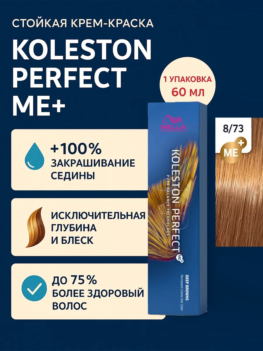 Koleston Perfect ME+ Крем-краска для волос 8/73, 60мл - 1шт. Знаменитая своим действительно совершенным, интенсивным и ярким результатом благодаря высококачественным ингредиентам и уникальной палитре богатых оттенков, она позволяет раскрыться творческому видению стилистов.
