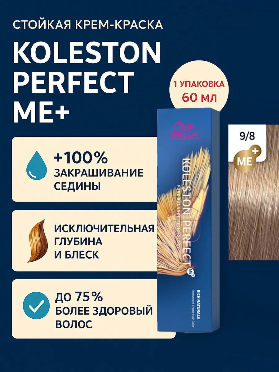 Koleston Perfect ME+ Крем-краска для волос 9/8, 60мл - 1шт. Знаменитая своим действительно совершенным, интенсивным и ярким результатом благодаря высококачественным ингредиентам и уникальной палитре богатых оттенков, она позволяет раскрыться творческому видению стилистов.