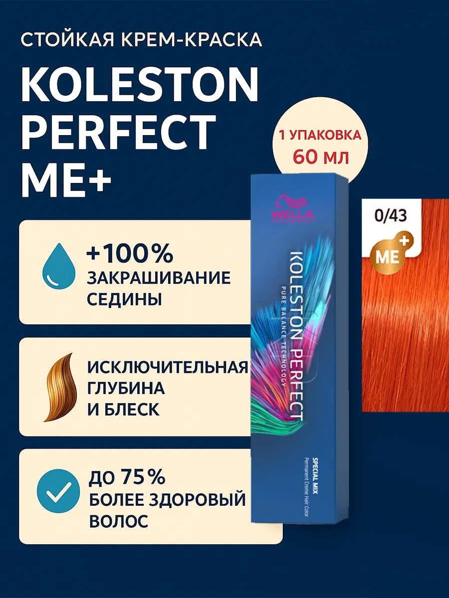 Koleston Perfect ME+ Крем-краска для волос 0/43, 60мл - 1шт. Знаменитая своим действительно совершенным, интенсивным и ярким результатом благодаря высококачественным ингредиентам и уникальной палитре богатых оттенков, она позволяет раскрыться творческому видению стилистов.