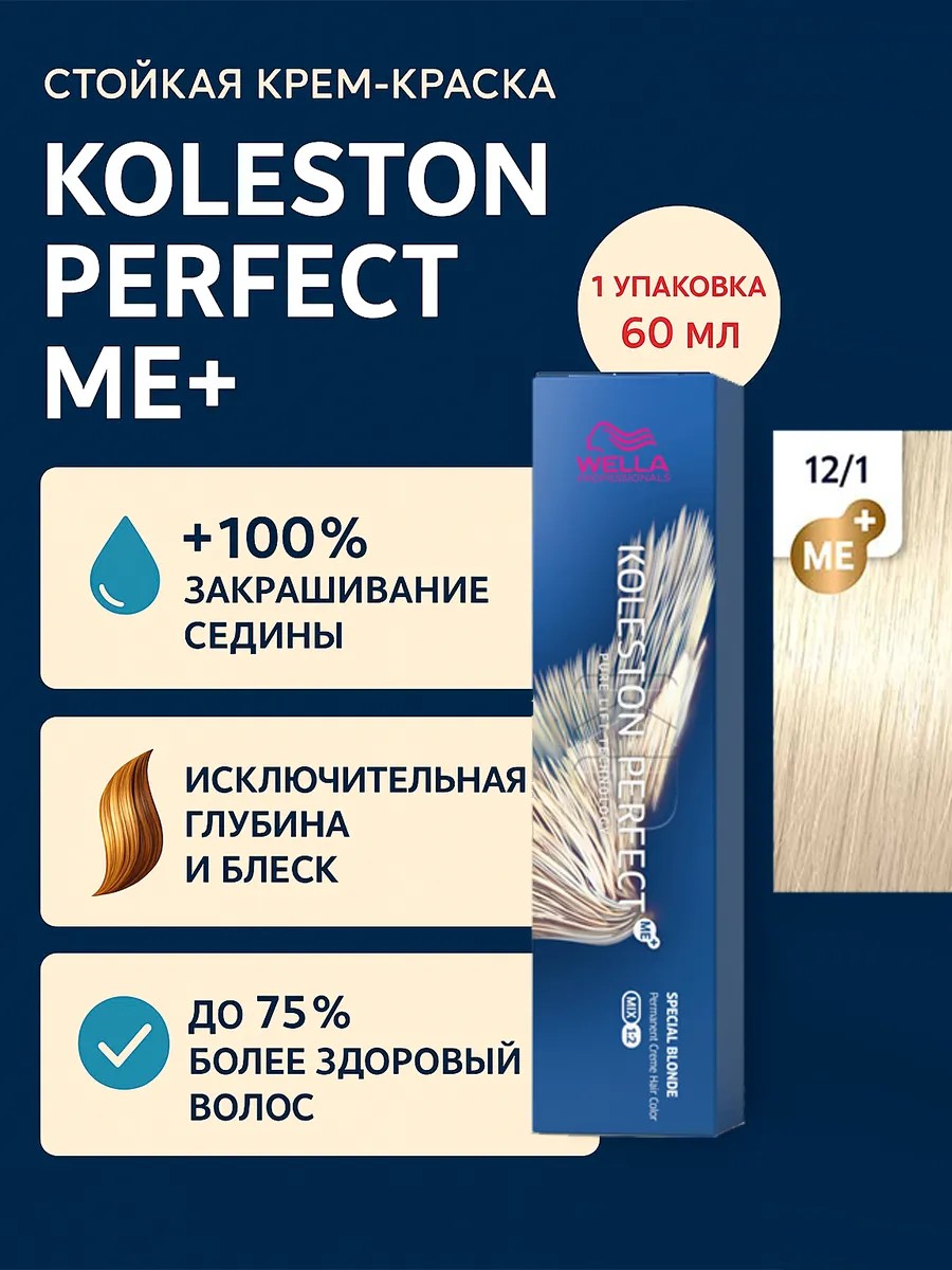 Koleston Perfect ME+ Крем-краска для волос 12/1, 60мл - 1шт. Знаменитая своим действительно совершенным, интенсивным и ярким результатом благодаря высококачественным ингредиентам и уникальной палитре богатых оттенков, она позволяет раскрыться творческому видению стилистов.