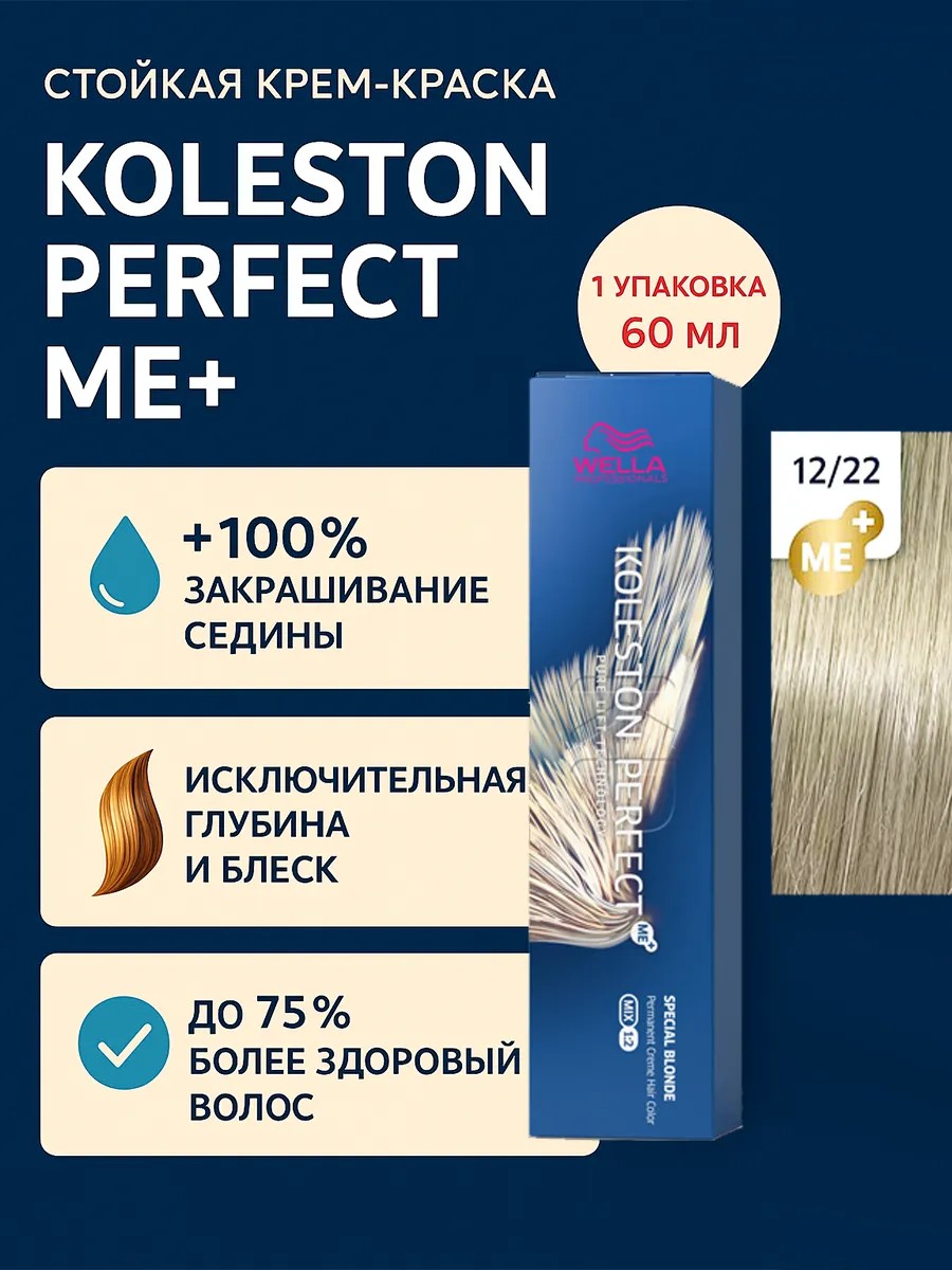 Koleston Perfect ME+ Крем-краска для волос 12/22, 60мл - 1шт. Знаменитая своим действительно совершенным, интенсивным и ярким результатом благодаря высококачественным ингредиентам и уникальной палитре богатых оттенков, она позволяет раскрыться творческому видению стилистов.