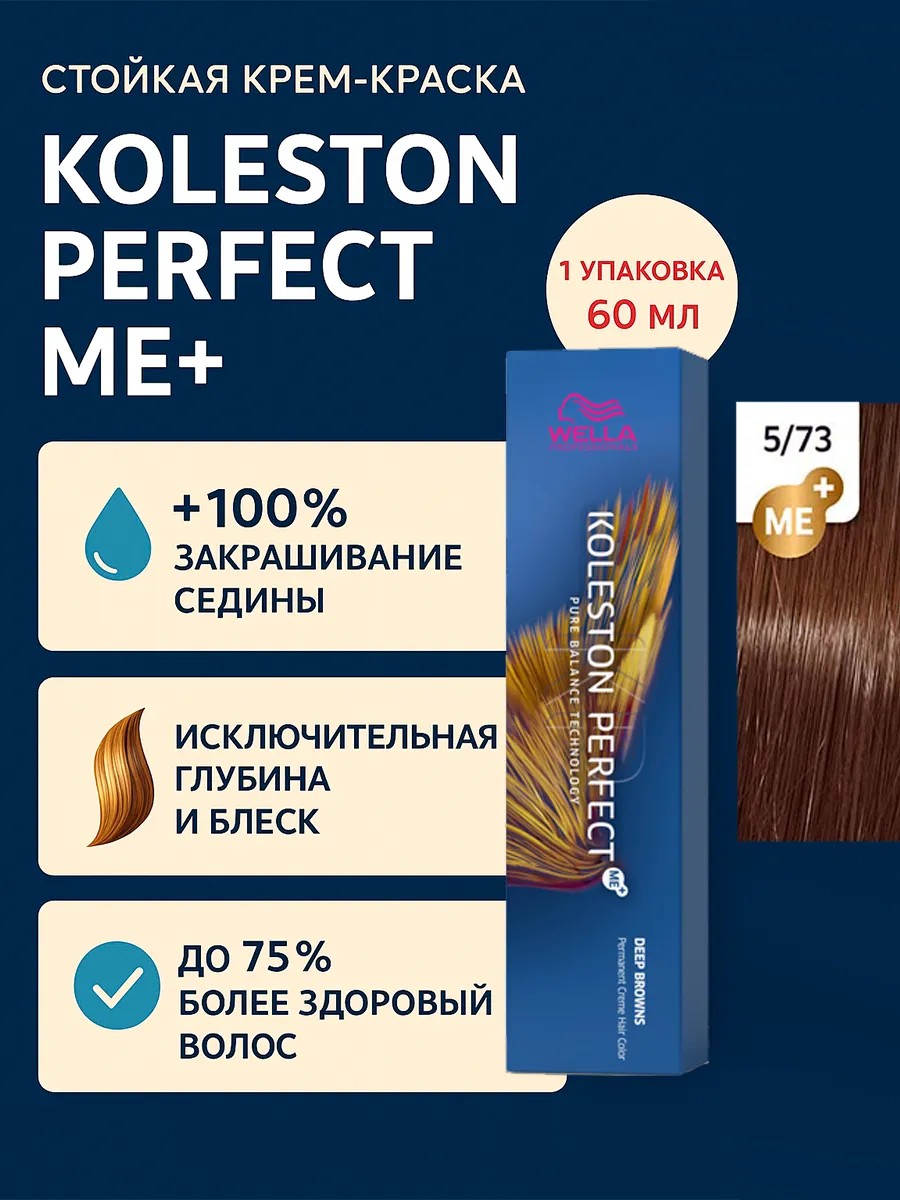 Koleston Perfect ME+ Крем-краска для волос 5/73, 60мл - 1шт. Знаменитая своим действительно совершенным, интенсивным и ярким результатом благодаря высококачественным ингредиентам и уникальной палитре богатых оттенков, она позволяет раскрыться творческому видению стилистов.