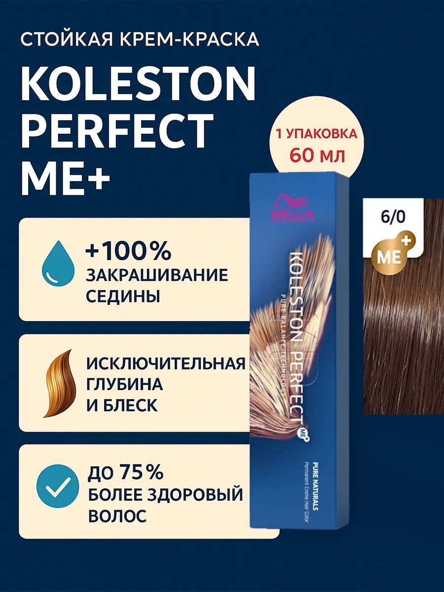 Koleston Perfect ME+ Крем-краска для волос 6/0, 60мл - 1шт. Знаменитая своим действительно совершенным, интенсивным и ярким результатом благодаря высококачественным ингредиентам и уникальной палитре богатых оттенков, она позволяет раскрыться творческому видению стилистов.