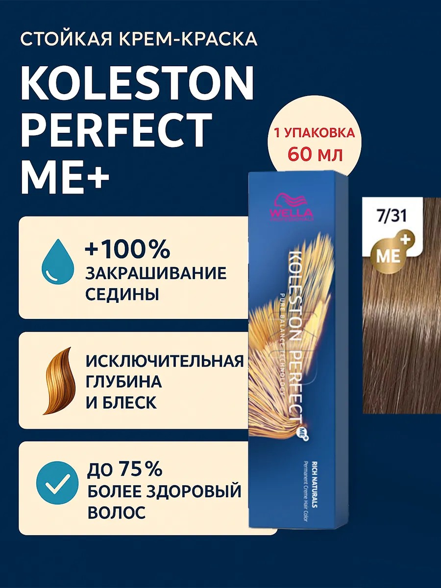 Koleston Perfect ME+ Крем-краска для волос 7/31, 60мл - 1шт. Знаменитая своим действительно совершенным, интенсивным и ярким результатом благодаря высококачественным ингредиентам и уникальной палитре богатых оттенков, она позволяет раскрыться творческому видению стилистов.