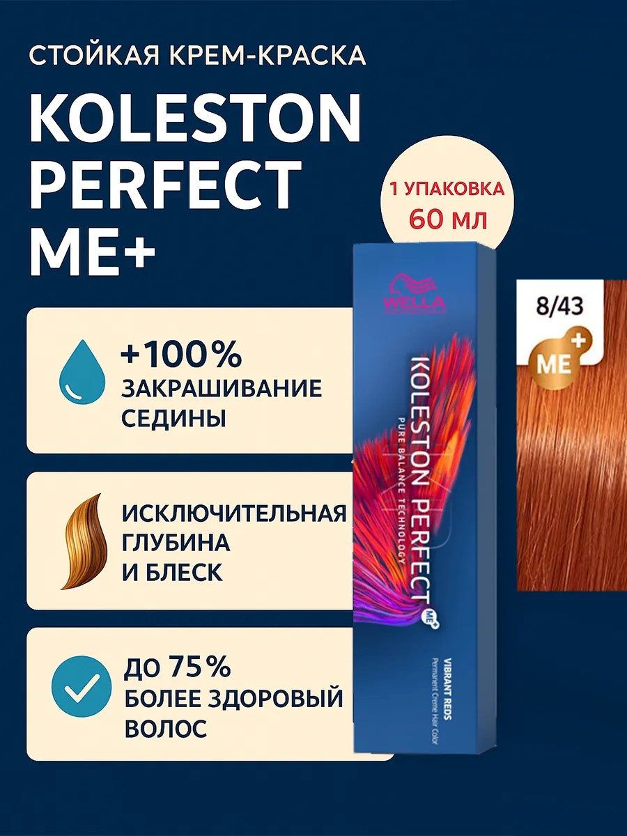 Koleston Perfect ME+ Крем-краска для волос 8/43, 60мл - 1шт. Знаменитая своим действительно совершенным, интенсивным и ярким результатом благодаря высококачественным ингредиентам и уникальной палитре богатых оттенков, она позволяет раскрыться творческому видению стилистов.