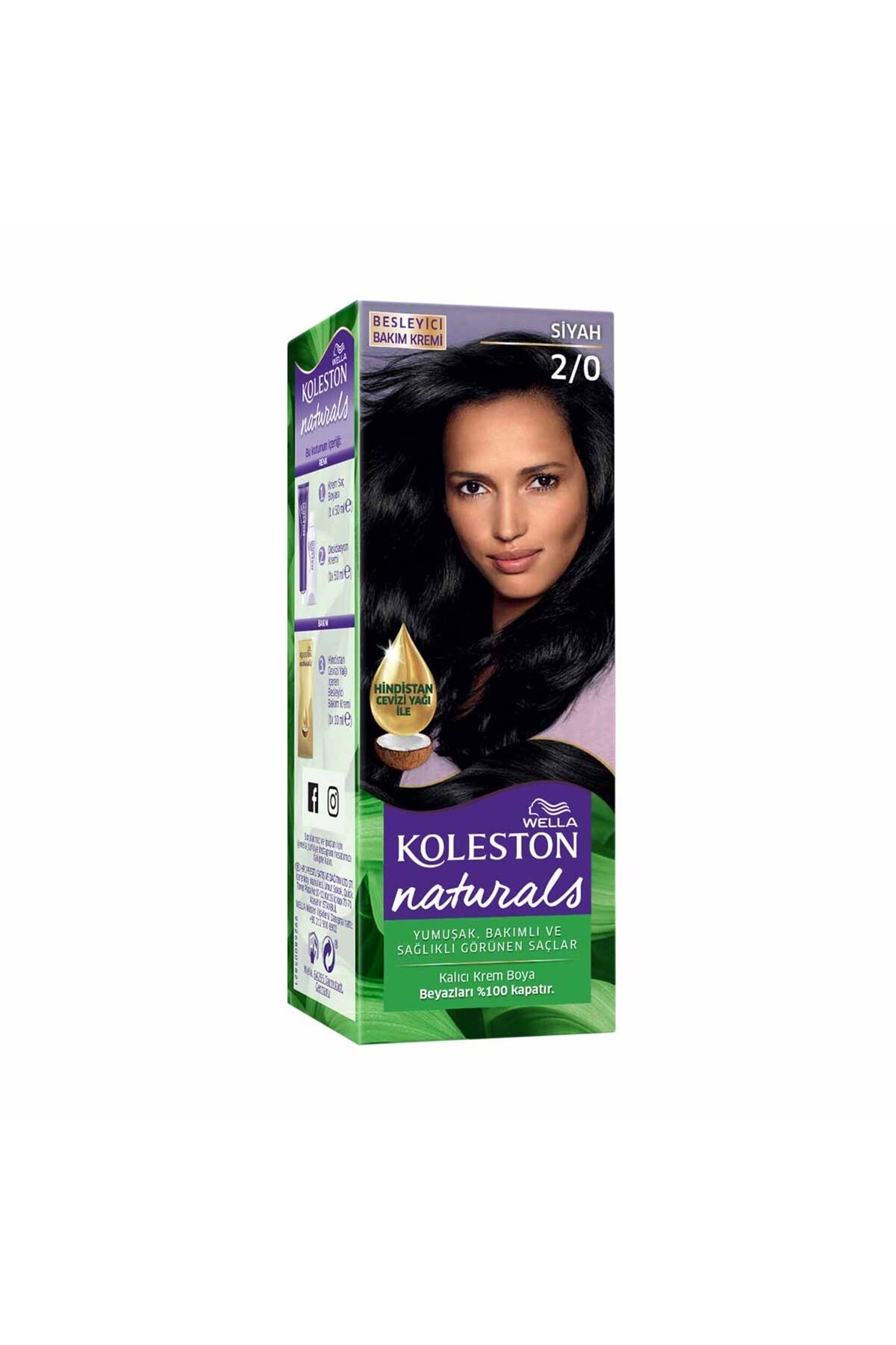 Discover Wella Koleston Naturals and enjoy gorgeous, intense color for up to 6 weeks. It perfectly covers even the most stubborn gray hairs from root to tip. Wella Koleston Naturals is formulated by combining intense color pigments with a nourishing serum containing coconut oil, thanks to its special system developed in Wella Laboratories.This package includes:• 1 Cream Paint 50 ml• 1 Oxidation Cream 50 ml• 1 Care Cream Containing Coconut Oil 10 ml• 1 User Manual• 1 Pair of GlovesIMPORTANT SAFETY WARNINGSEven if you have used dye products before, always perform an allergy test 48 hours before dyeing. Therefore, do not forget to buy the product 48 hours before painting.CAUTION: HAIR DIES MAY CAUSE SEVERE ALLERGIC REACTIONS. READ AND FOLLOW THE INSTRUCTIONS. The product is not suitable for use by those under 16 years of age. Temporary "henna" tattoos may increase your risk of allergies.Do not dye your hair in the following cases:• If you have a rash on your face or sensitive, irritated or damaged scalp.• If you have ever had an allergic reaction to hair dyes.• If you have ever had an allergic reaction to temporary henna tattoos.• If you experience any reaction or if you are in doubt, consult a doctor before using any dye product.Rinse your hair thoroughly after application. Avoid contact with eyes. In case of contact, wash your eyes with plenty of water. Do not use to dye eyebrows and eyelashes. Use suitable gloves. Keep out of reach of children.Usage1. Preparing the paint mixture: Put on your gloves. Pour the contents of the cream paint tube into a non-metallic (plastic, glass or porcelain) bowl. Add the oxidation cream and mix with a paintbrush until you obtain a homogeneous paint mixture. To get the best dye result, apply the mixture to your hair immediately after preparing it.2. Applying the dye mixture: For the first dyeing, apply the dye mixture to unwashed hair, strand by strand, with a dye brush. Make sure you apply it all over your hair. Then, comb your hair with a wide-tooth comb to distribute the mixture evenly. For deep dyeing, divide your hair into sections and apply the dye mixture piece by piece first. After leaving the dye mixture on your hair for 20 minutes, comb it evenly towards the lower parts of your hair.3. Waiting time: Total waiting time is 30 minutes for bottom dyeing, 20 minutes for bottom dyeing and 10 minutes for dyeing the whole hair. The color of the hair dye mixture may change over time.4. Care for your hair with Nutritious Care Cream containing Coconut Oil:• Apply nourishing care cream to deeply care for your hair.• Leave it for 2 minutes and then rinse thoroughly.ContentsCream Dye: Aqua Water Eau, Cetearyl Alcohol, Glyceryl Stearate SE, Sodium Laureth Sulfate, Ammonia, Glycol Distearate, Lanolin Alcohol, Sodium Lauryl Sulfate, Toluene-2,5-Diamine Sulfate, Sodium Cocoyl Isethionate, Sodium Sulfite, Resorcinol, Ascorbic Acid, 2-Amino-6-Chloro-4-Nitrophenol, Parfum Fragrance, m-Aminophenol, Disodium EDTA, 4-Amino-2-Hydroxytoluene, Tocopherol.Oxidation Cream: Aqua Water Eau, Hydrogen Peroxide, Cetearyl Alcohol, Sodium Lauryl Sulfate, Salicylic Acid, Disodium Phosphate, Phosphoric Acid, Disodium Pyrophosphate, Sodium Stannate, Etidronic Acid.Care Cream: Aqua Water Eau, Bis-Hydroxy Methoxy Amodimethicone, Stearyl Alcohol, Cetyl Alcohol, Stearamidopropyl Dimethylamine, Glutamic Acid, Parfum Fragrance, Benzyl Alcohol, Citric Acid, Benzyl Benzoate, EDTA, Histidine, Cocos Nucifera (Coconut) Oil, Sodium Chloride, Hexyl Cinnamal, Linalool, Magnesium Nitrate, Trimethylsiloxysilicate, Aloe Barbadensis Leaf Juice, Methylchloroisothiazolinone, Magnesium Chloride, Methylisothiazolinone, Ascorbic Acid, Potassium Sorbate, Sodium Benzoate, Sodium Sulfite.