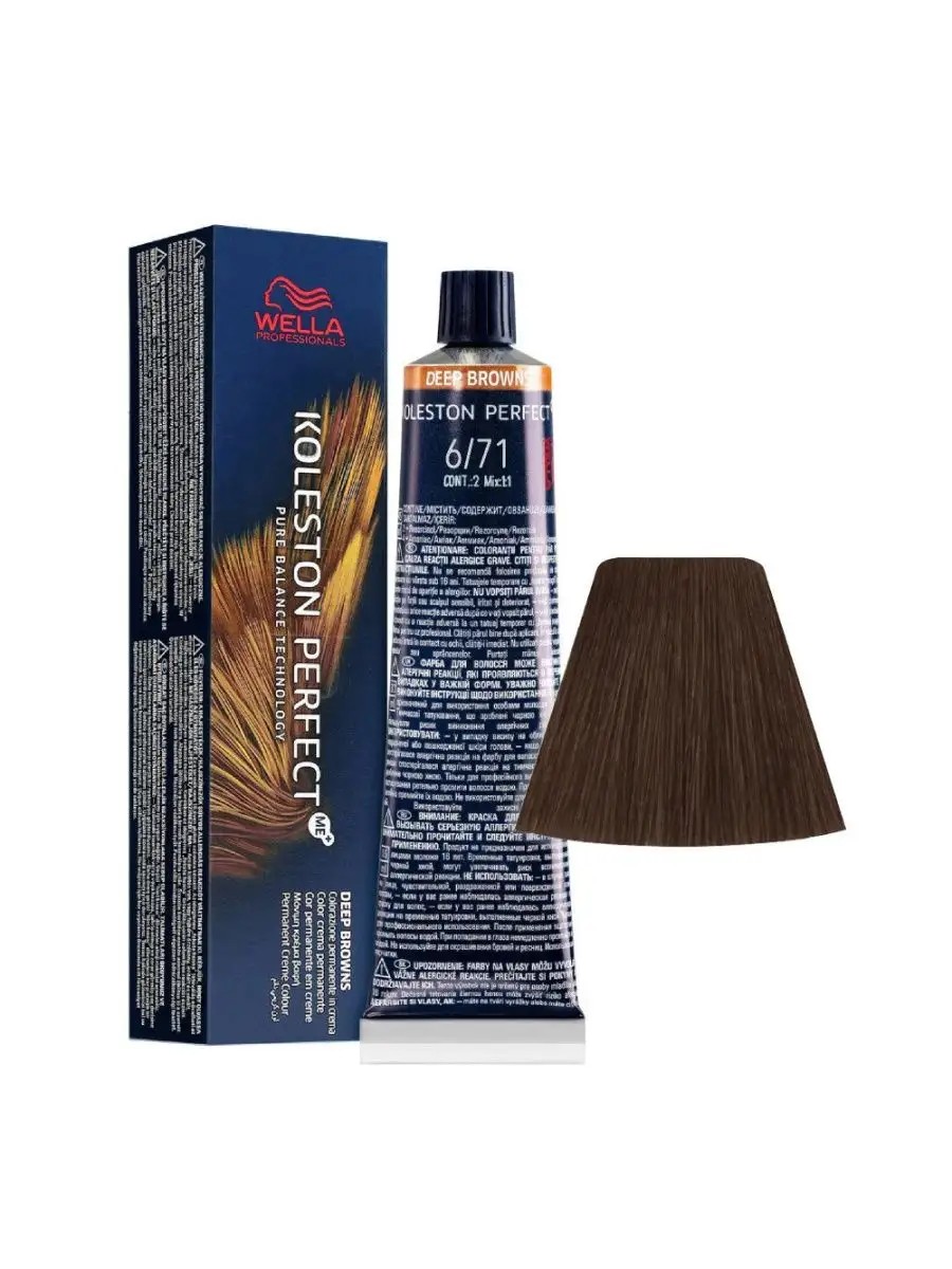 Koleston Perfect ME+ Крем-краска cтойкая 6/71 Королевский соболь 60 мл. Действие красителя основано на технологии Pure Balance. Она нейтрализует частицы металлов, которые присутствуют в волосах, тем самым защищает волосы от свободных радикалов. Из-за этого некоторые оттенки во время окислительного процесса могут выглядеть иначе. Не беспокойтесь – результат окрашивания будет полностью соответствовать вашим ожиданиям.