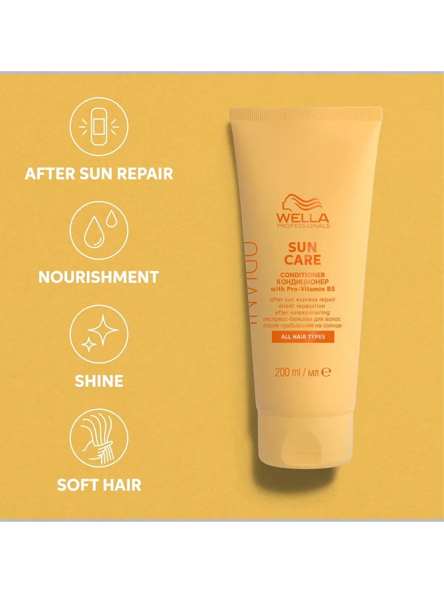 Invigo After Sun Express Conditioner, a deeply moisturizing express conditioner for hair after sun exposure, instantly restores hair and restores its natural shine. Wella Invigo Sun hair conditioner, enriched with vitamin E, nourishes hair, gives it a healthy look and leaves it soft to the touch. With the Sun-BlendTM formula (protection from sun exposure), it reliably protects hair from solar UV radiation. It provides a comprehensive, moisturizing and restorative effect. Guarantees maximum effect and fast results. Prevents hair fading. Directions: Apply to clean, damp hair and leave for 3-5 minutes. Rinse with water without shampoo. Suitable for frequent use.
