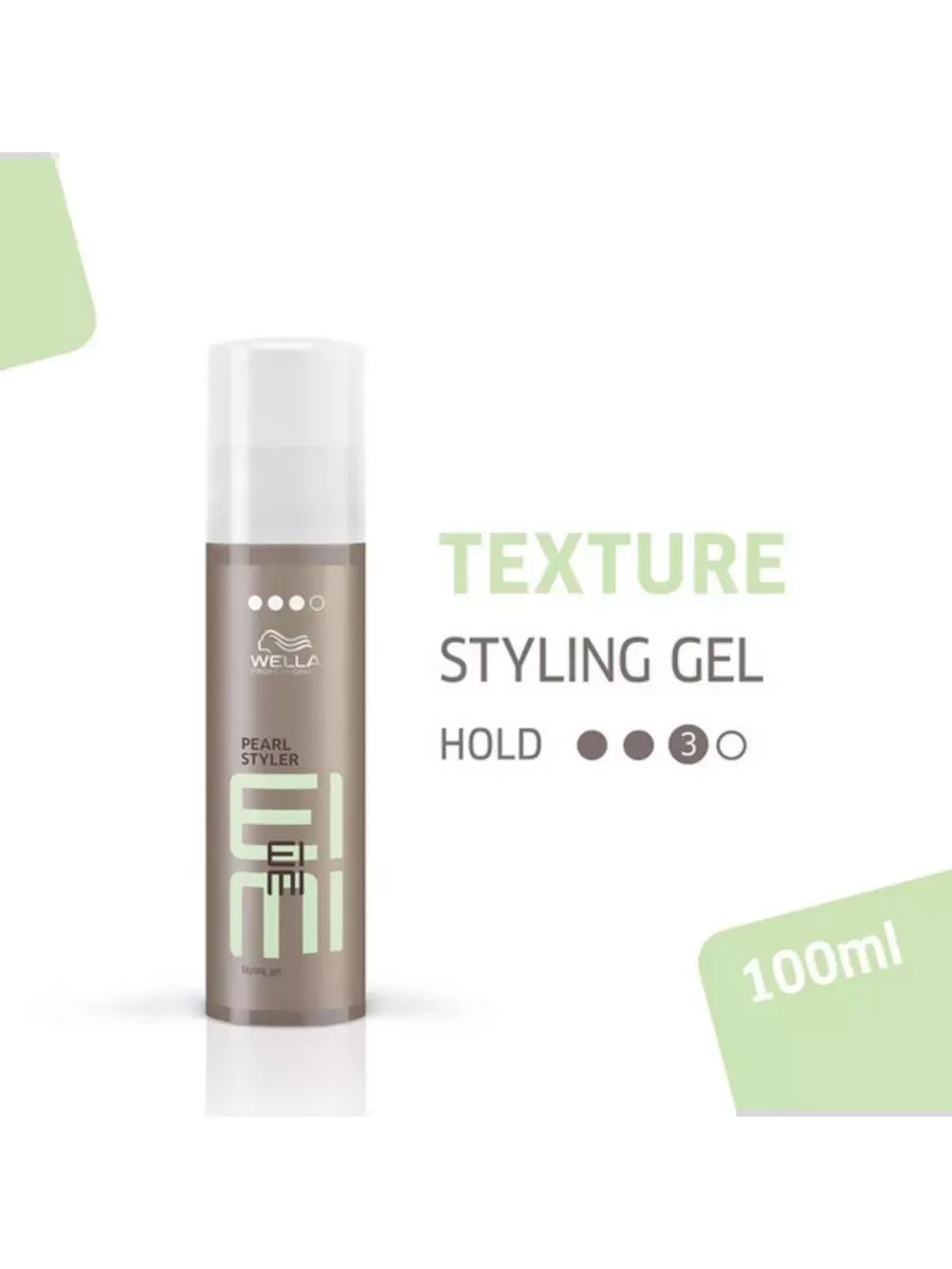 Wella EIMI Pearl Styler. Action. Pearl Styler modeling gel provides perfect hair hold and has a hold level of 3. The gel allows you to create a variety of styling options, creative hairstyles, and stylish and fashionable hairstyles that will last for a long time. The unique pearlescent consistency spreads perfectly over dry hair, adding texture, luxurious volume, and the desired styling shape. This luxurious modeling gel creates a pearlescent shine and gives the hairstyle clear lines. Result.