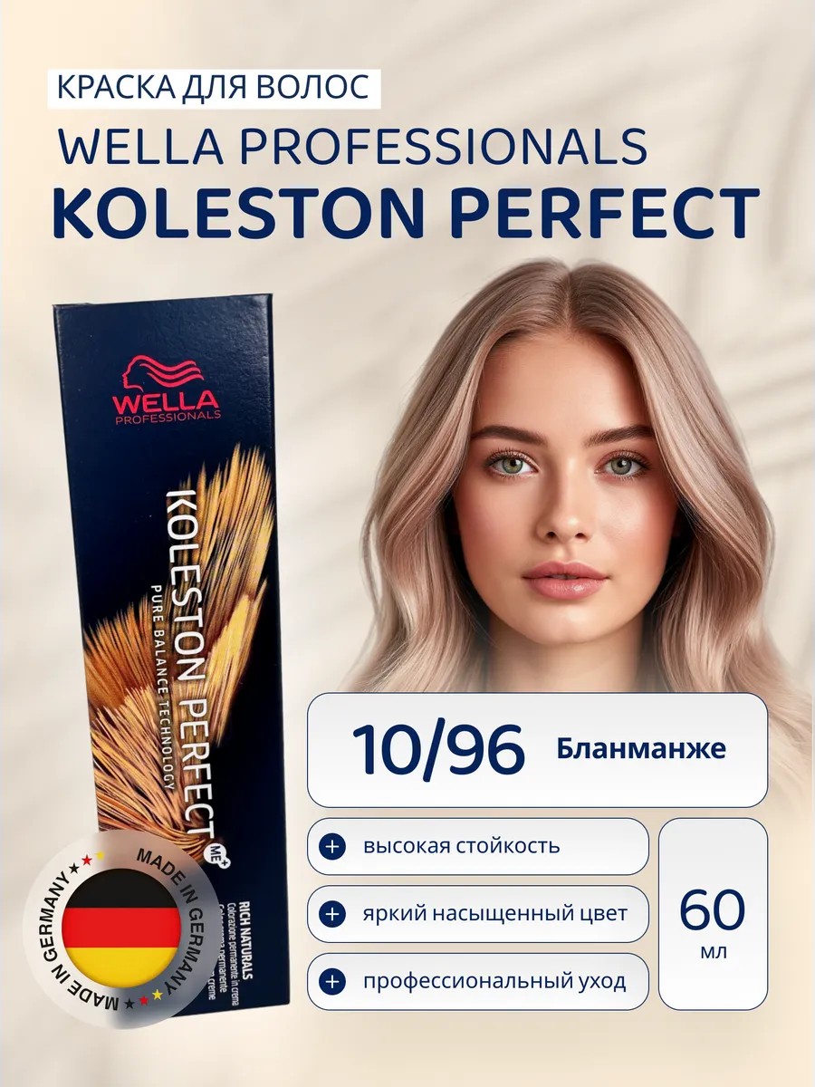 Introducing Wella Professional Koleston Perfect ME+, a professional hair dye. Shade 10.96 Blancmange. Wella Koleston Perfect permanent cream hair dye penetrates deep into the hair shaft, nourishing, coloring, and filling it with a bright, rich, and deep color. The desired result is achieved thanks to the high-quality ingredients of Wella hair dye. Koleston hair dye technology with ME+ molecules reduces the risk of allergies up to 60 times. Wella dye is easy to use, mixed with the original Welloxon oxidizer - see instructions in the photo. Wella hair dye is easy to apply and does not run. After coloring, up to 66% more shine, compared to uncolored hair. Result: silky, shiny hair, deep nutrition and rich color, 100% gray coverage, the possibility of 3 levels of lightening. To achieve the desired result, use strictly according to the enclosed instructions. Oxidizer is not included. Universal cream paint